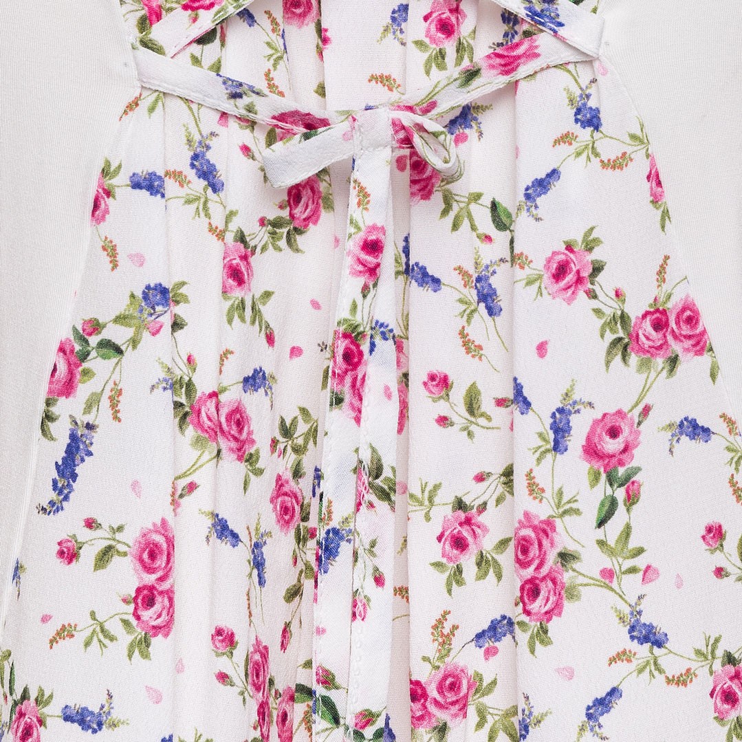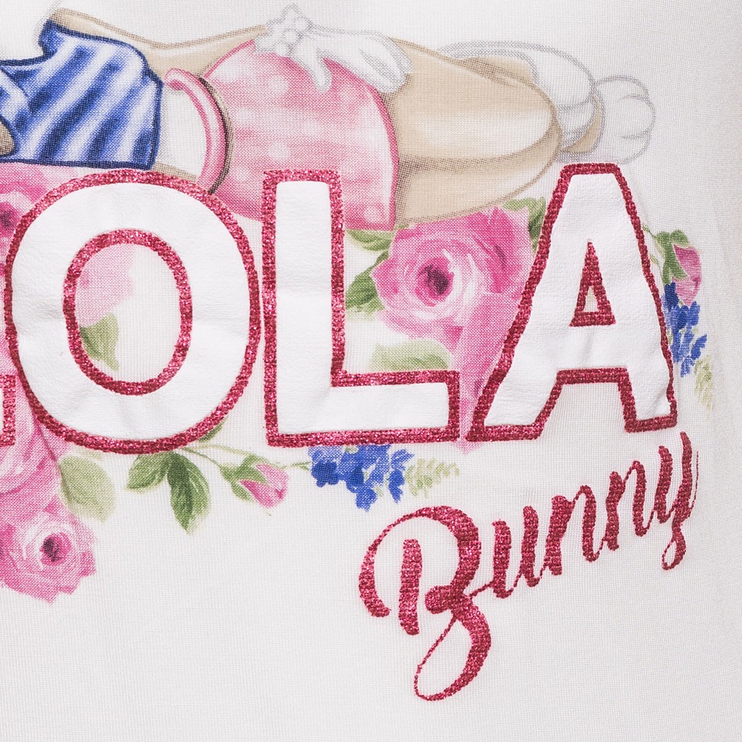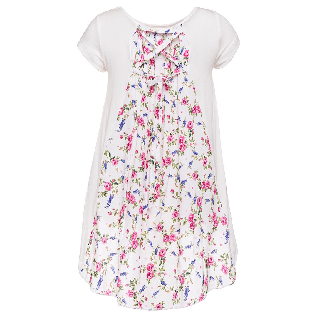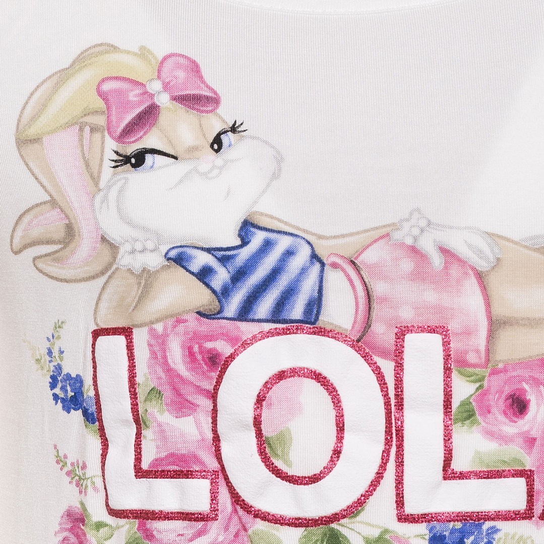 Bluzka dziewczęca z krótkim rękawem, z letniej kolekcji ekskluzywnych ubrań dla dzieci Monnalisa. Fason idealny na każdą sylwetkę. Bluzka nieznacznie rozszerzajaca się ku dołowi. Z przodu nadruk Loli. Plecy uszyte z połączenia dwóch materiałów. W środkowej części wszyta jest zwiewna, drukowana w drobne kwiatki tkanina, dekoracyjnie sznurowana u góry. Bluzka bardzo ładnie wygląda w połączeniu z legginsami, jeansami i szortami.