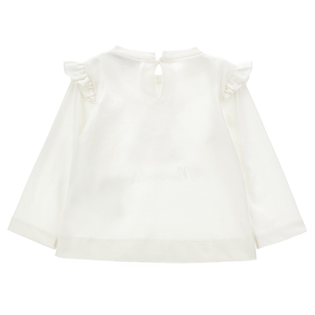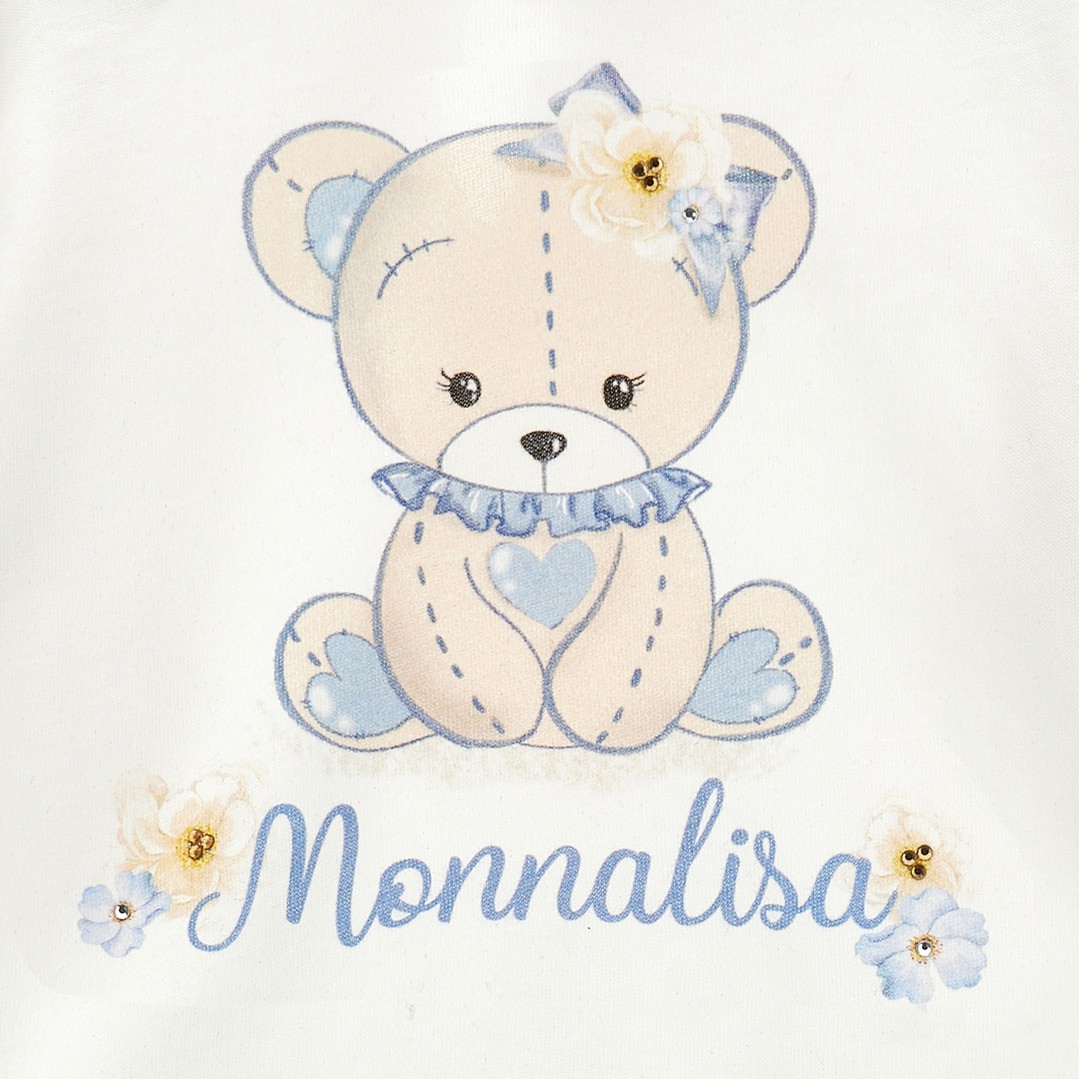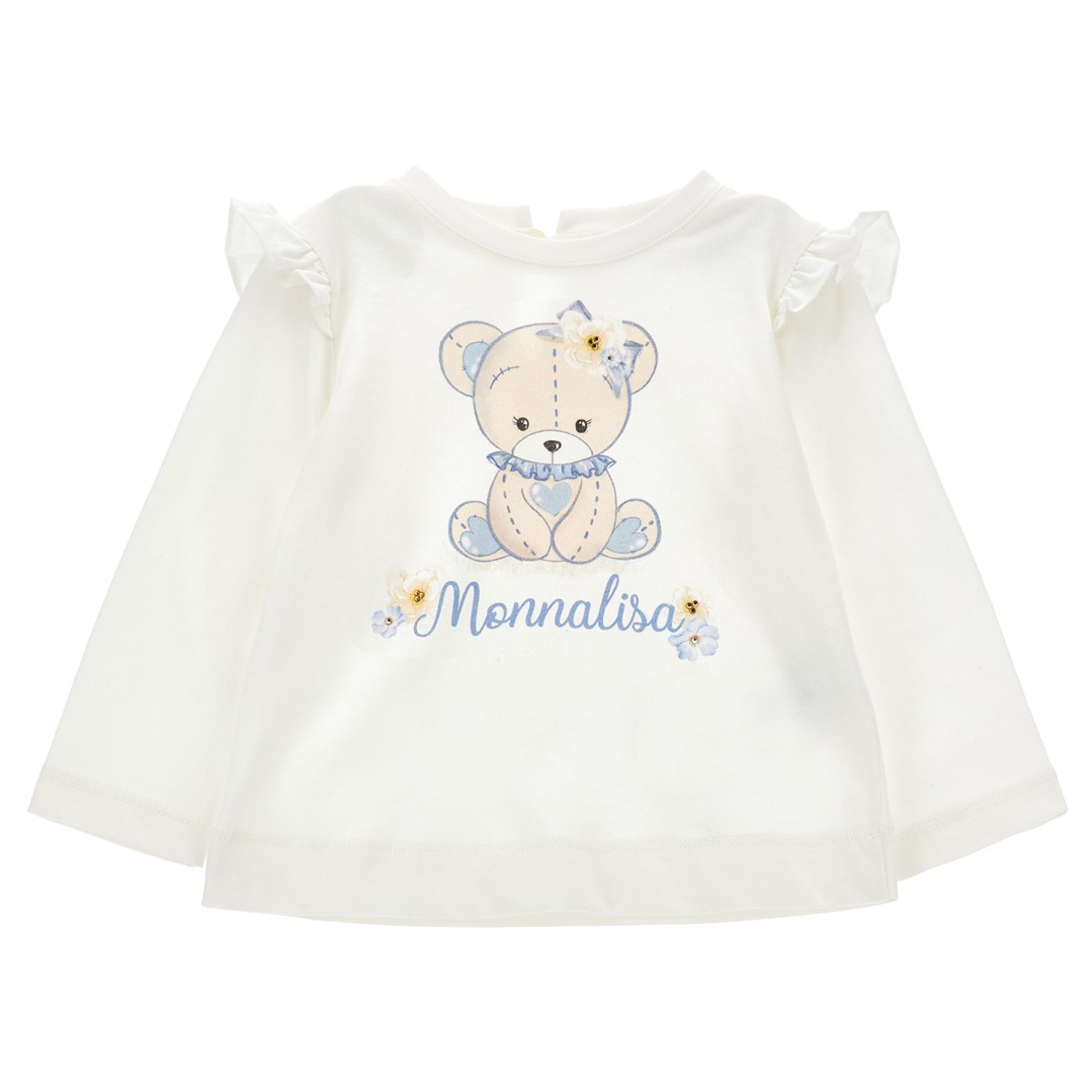 Bluzka niemowlęca dla dziewczynki Monnalisa 39F612 6005 0158. Ramiona koszulki ozdobione falbankami. Z przodu nadruk pluszowego misia w niebieskim kolorze.