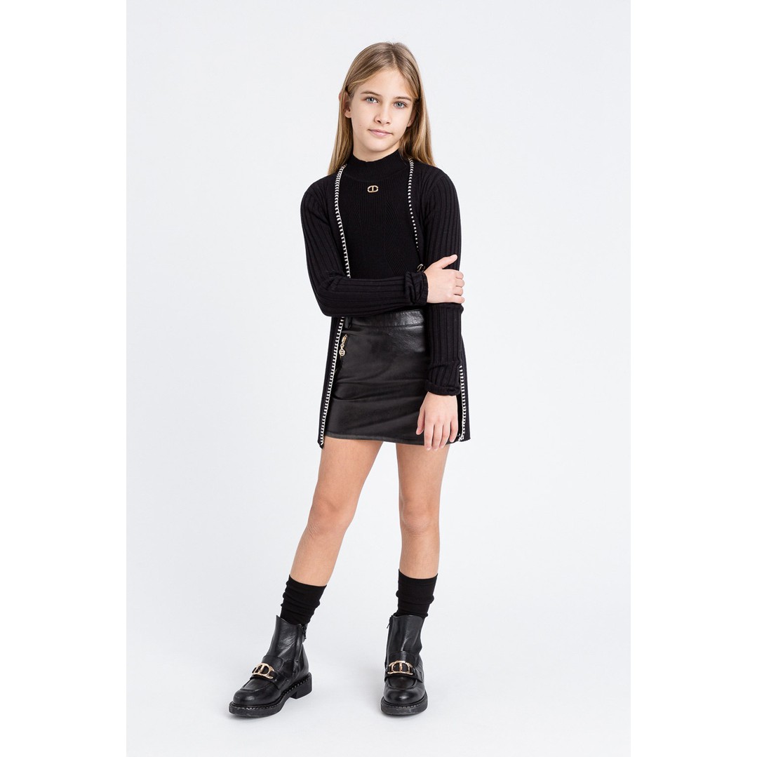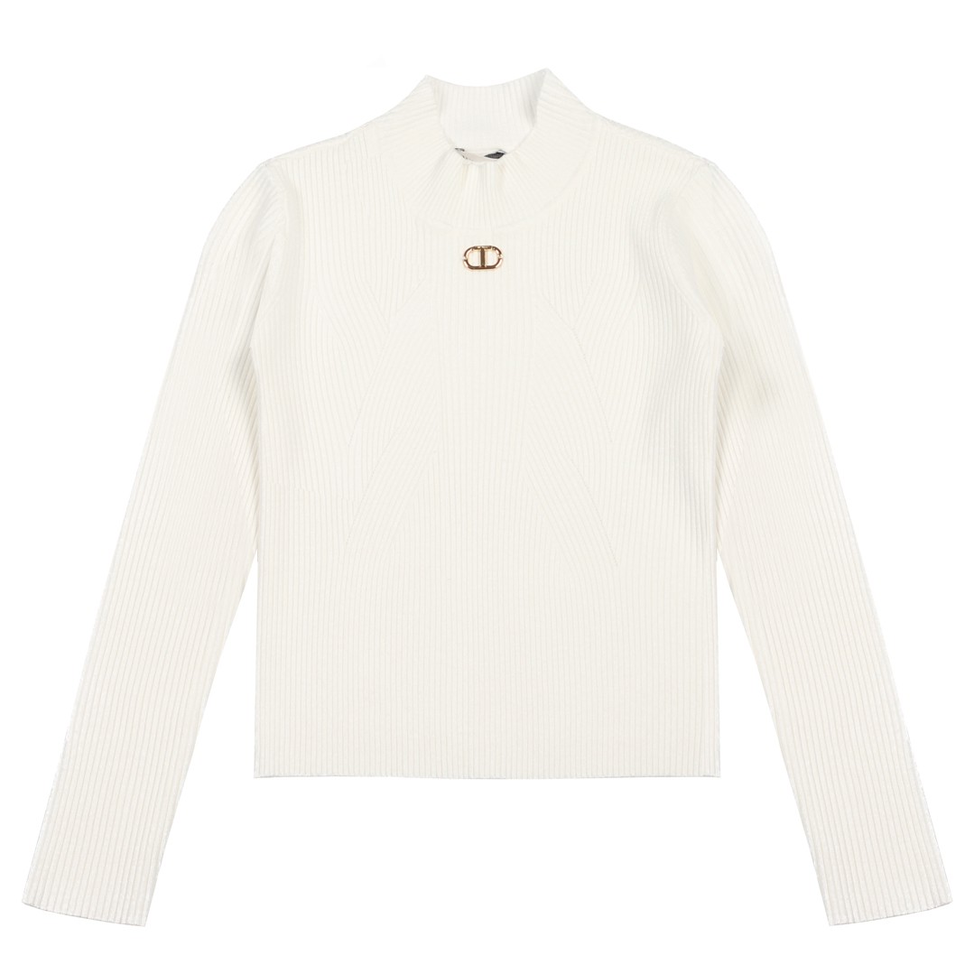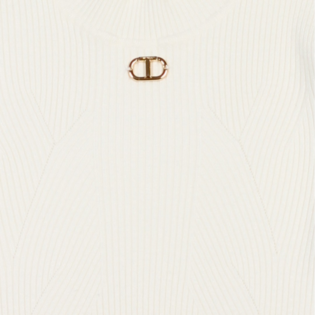 Śmietankowa bluzka swetrowa dla dziewczynki Twin Set, wykonana z mieszanki wiskozy. Jasna dzianina w ciepłej bieli tworzy prążki układające się w atrakcyjny wzór. Bluzka w minimalistycznym stylu z dyskretnym logo Oval T. Bluzka jest elegancką alternatywą dla koszul. Dopasowany krój świetnie doskonale nadaje się pod marynarkę czy bluzę.