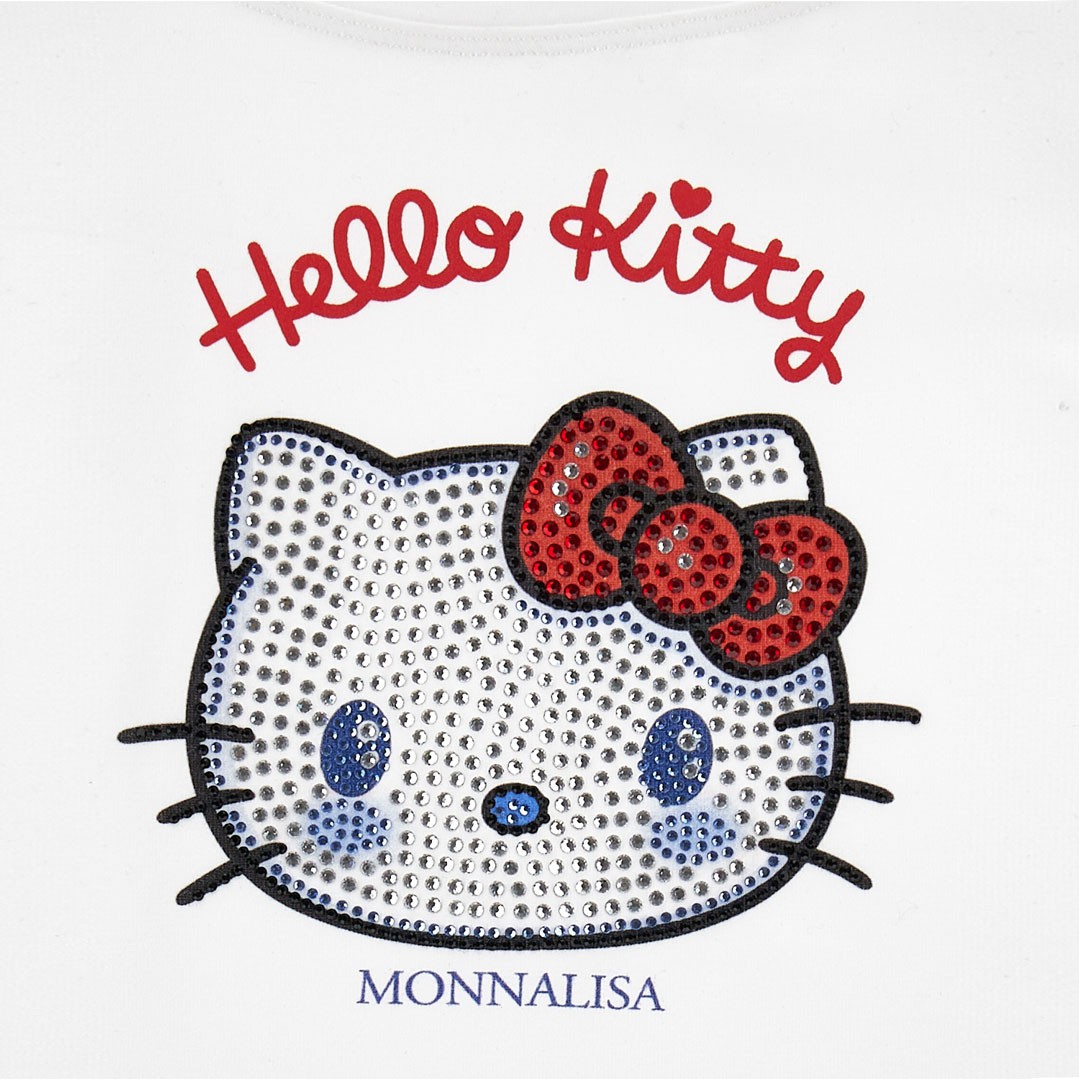 Dziewczęca koszulka Monnalisa 19G617 7005 0099 uszyta z białej, bawełnianej dzianiny. Model regular. Koszulka ozdobiona portretem Hello Kitty.
