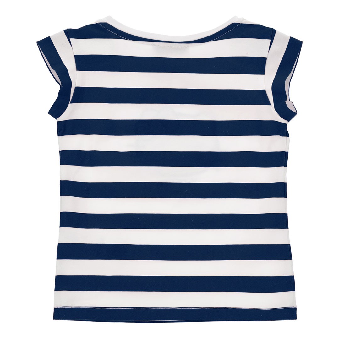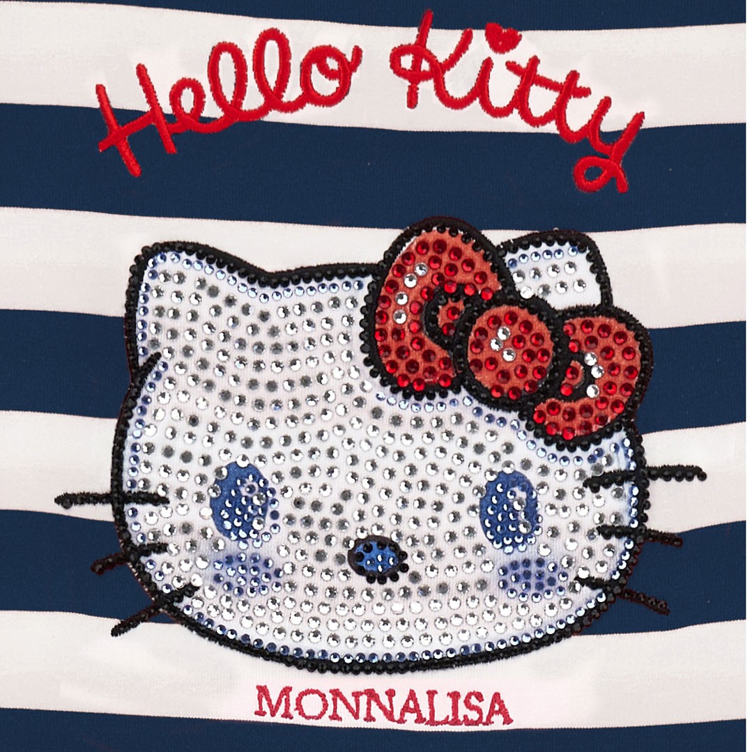 Dziewczęca koszulka z krótkim rękawem Monnalisa 19G617 7042 9956 uszyta z bawełnianej dzianiny w biało-granatowe, poziome pasy. Model regular. Koszulka ozdobiona portretem Hello Kitty.