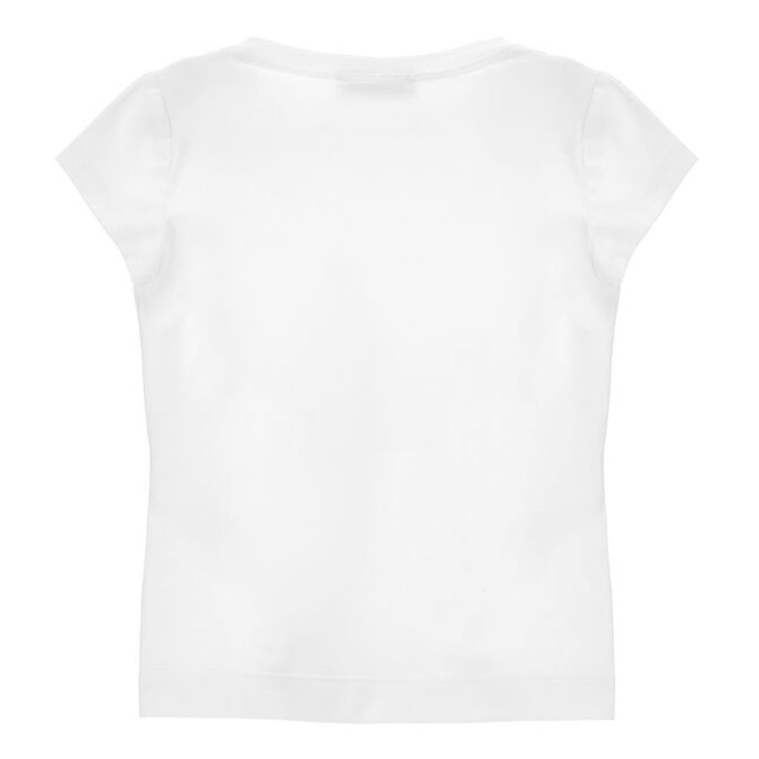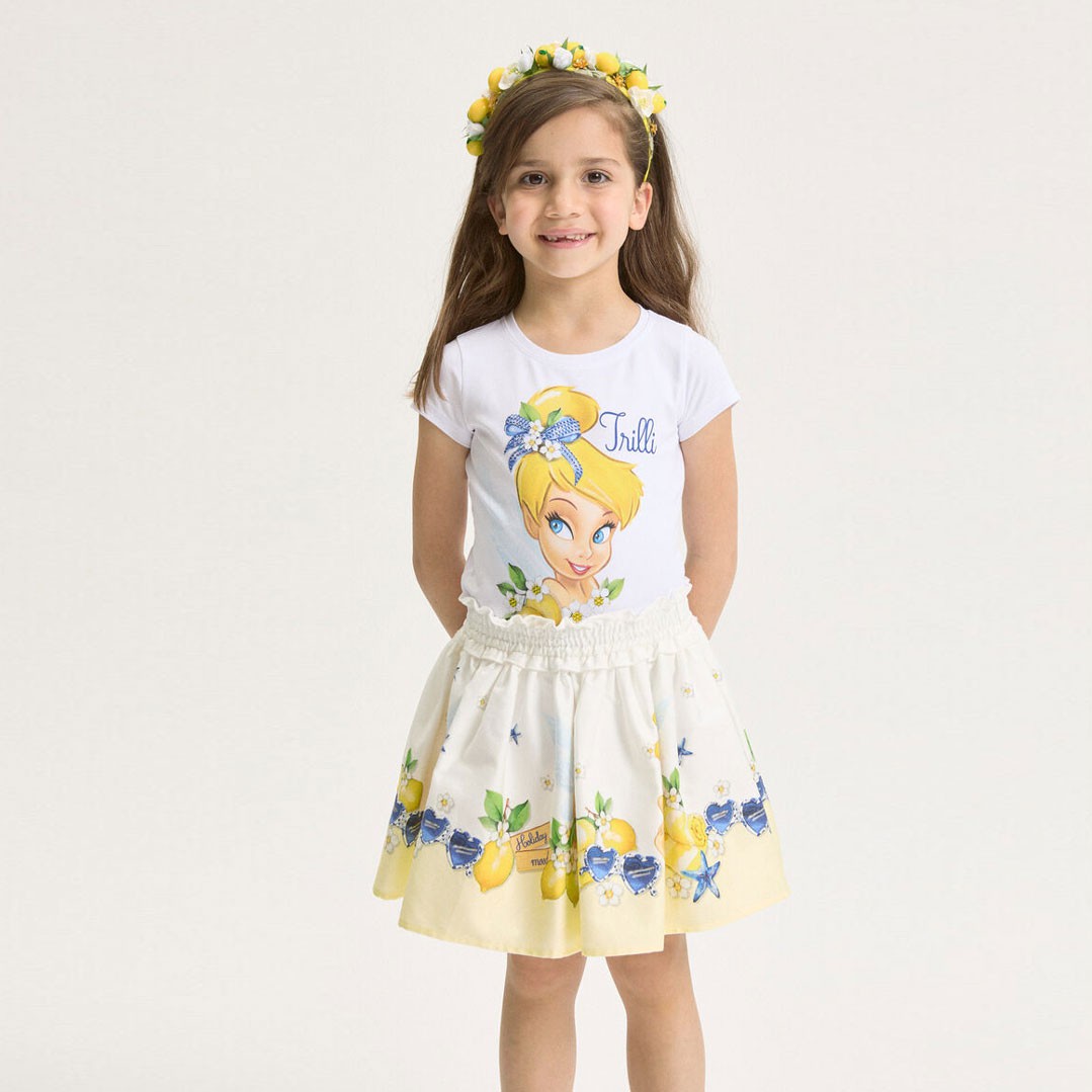 Biały t-shirt dla dziewczynki Monnalisa 19G622 7032 0099 z linii Bimba Main Trilli. Koszulka z przewiewnej bawełnianej dzianiny z dodatkiem elastanu, ozdobiona nadrukiem przedstawiającym Portret Trilli, bajkowego Dzwoneczka. Fason regular.