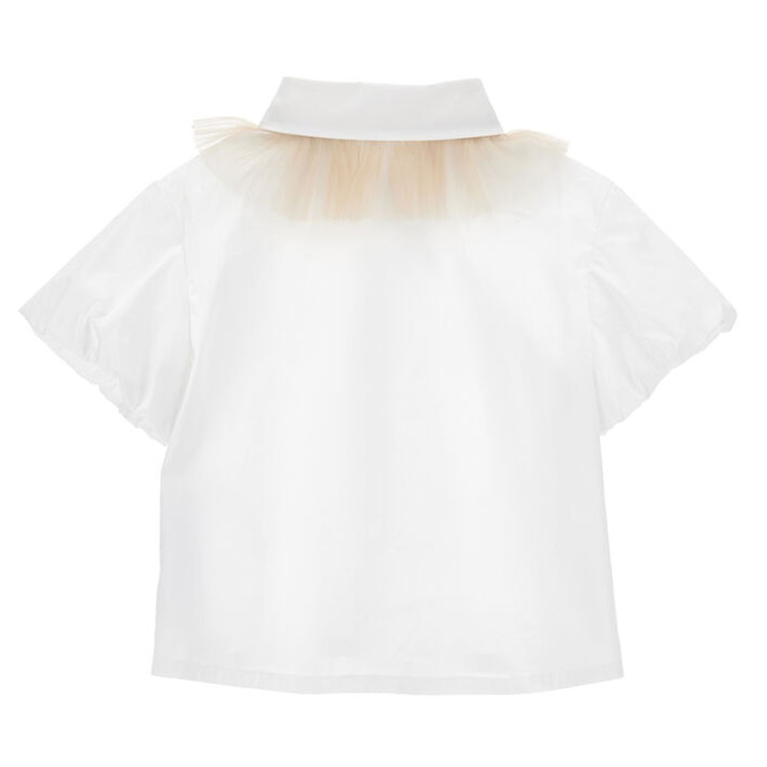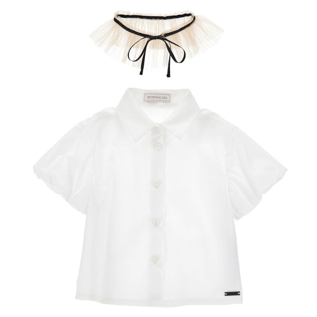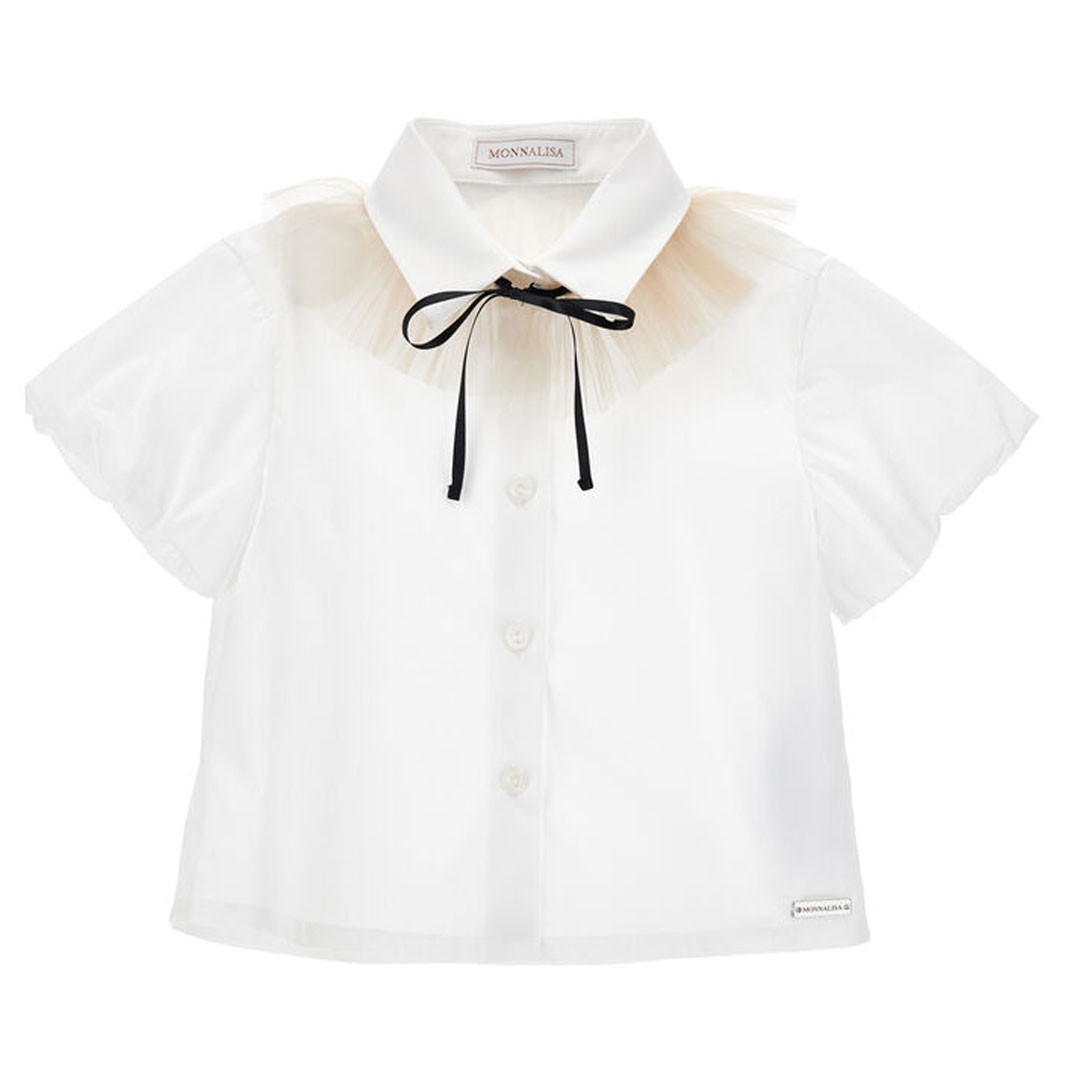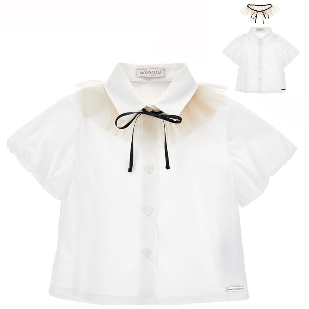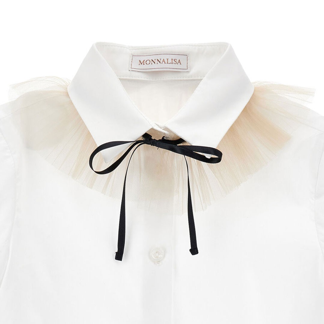 Elegancka, zapinana na guziki, biała koszula dziewczęca z kołnierzykiem Monnalisa 17G300 7153 9903. Bluzka koszulowa wykonana jest z elastycznego, bawełnianego płótna stretch gwarantujacego wygodę. Model bluzki dziewczęcej Monnalisa Basic 17G300 7153 9903 idealnie nadaje się na wszelkie uroczystości oraz jako element stroju galowego do szkoły. Do koszuli dołączony jest dodatkowy tiulowy kołnierzyk w naturalnym kolorze, wiązany na czarną tasiemkę.