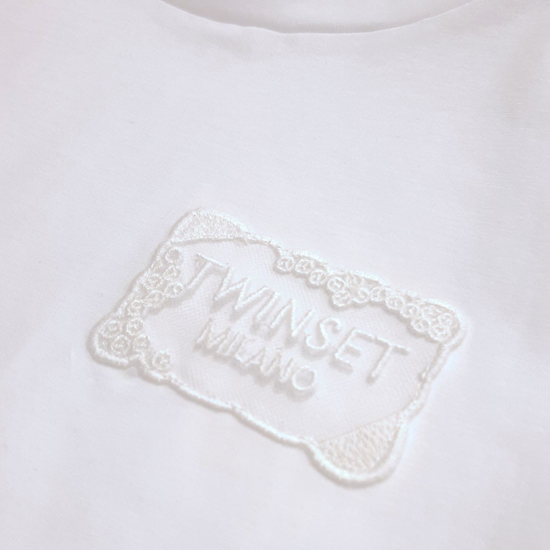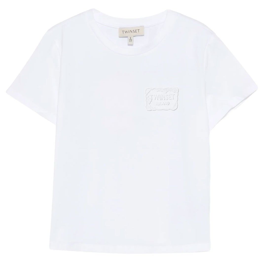 Biały t-shirt dla dziewczynki Twin Set 261GJ2091 00526 uszyty z doskonałej jakośc,i bawełnianej dzianiny. Z przodu biała, koronkowa aplikacja.