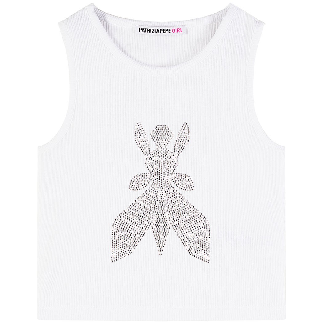 Biały top dla dziewczynki Patrizia Pepe 7M0977 J267 W146 możesz kupić w sklepie euroyoung.pl w rozmiarach 6 - 16 lat. Krótki, dopasowany top wykonany jest z przyjaznej dla skóry bawełnianej dzianiny o prążkowanej strukturze i ozdobiony z przodu postacią muchy - ikony marki.