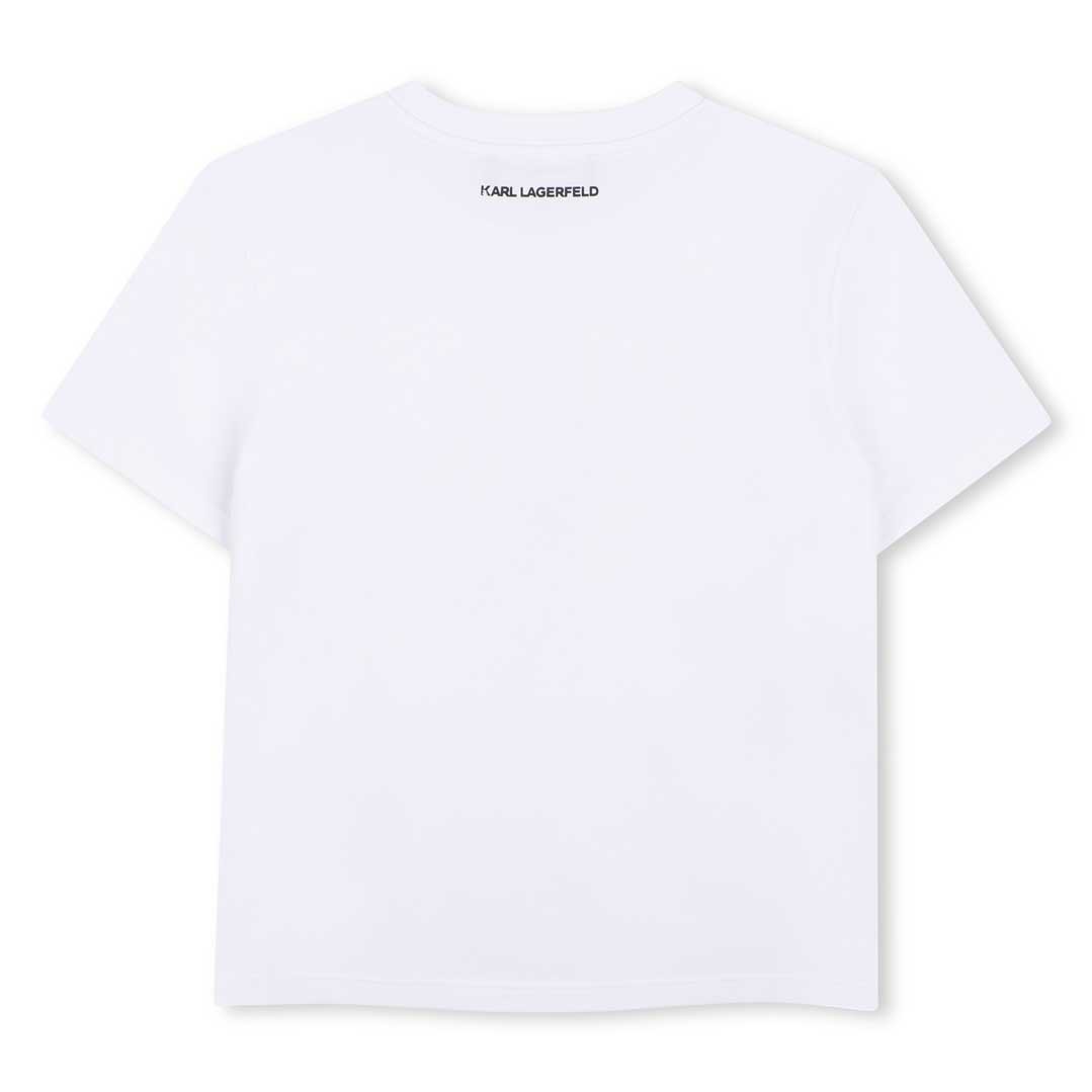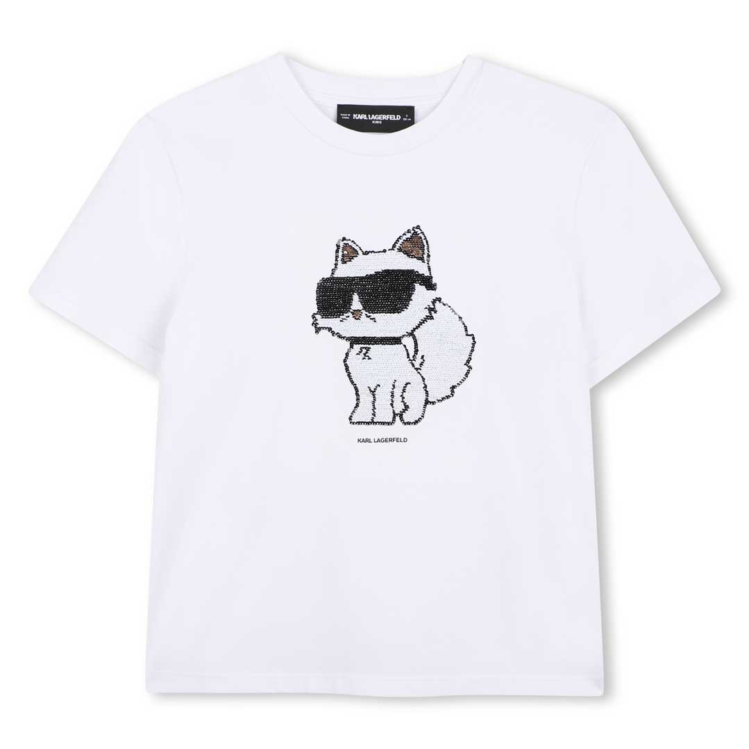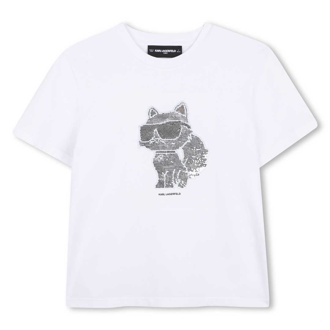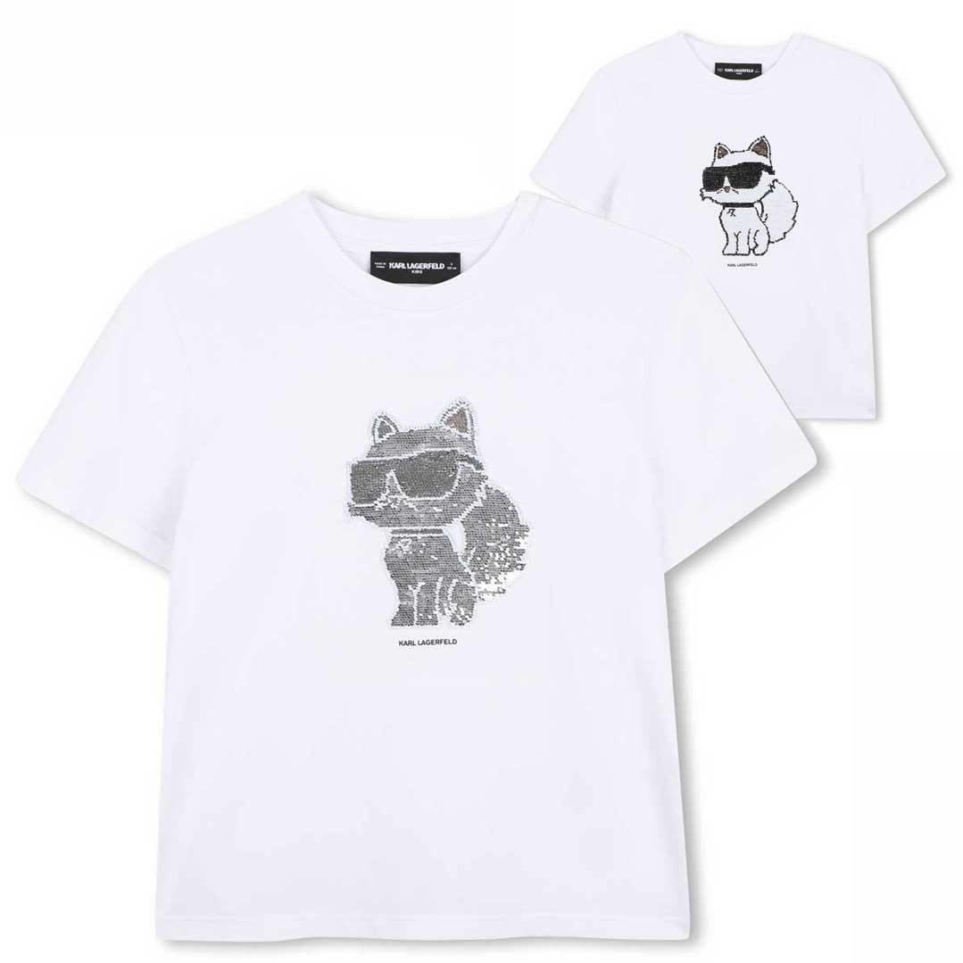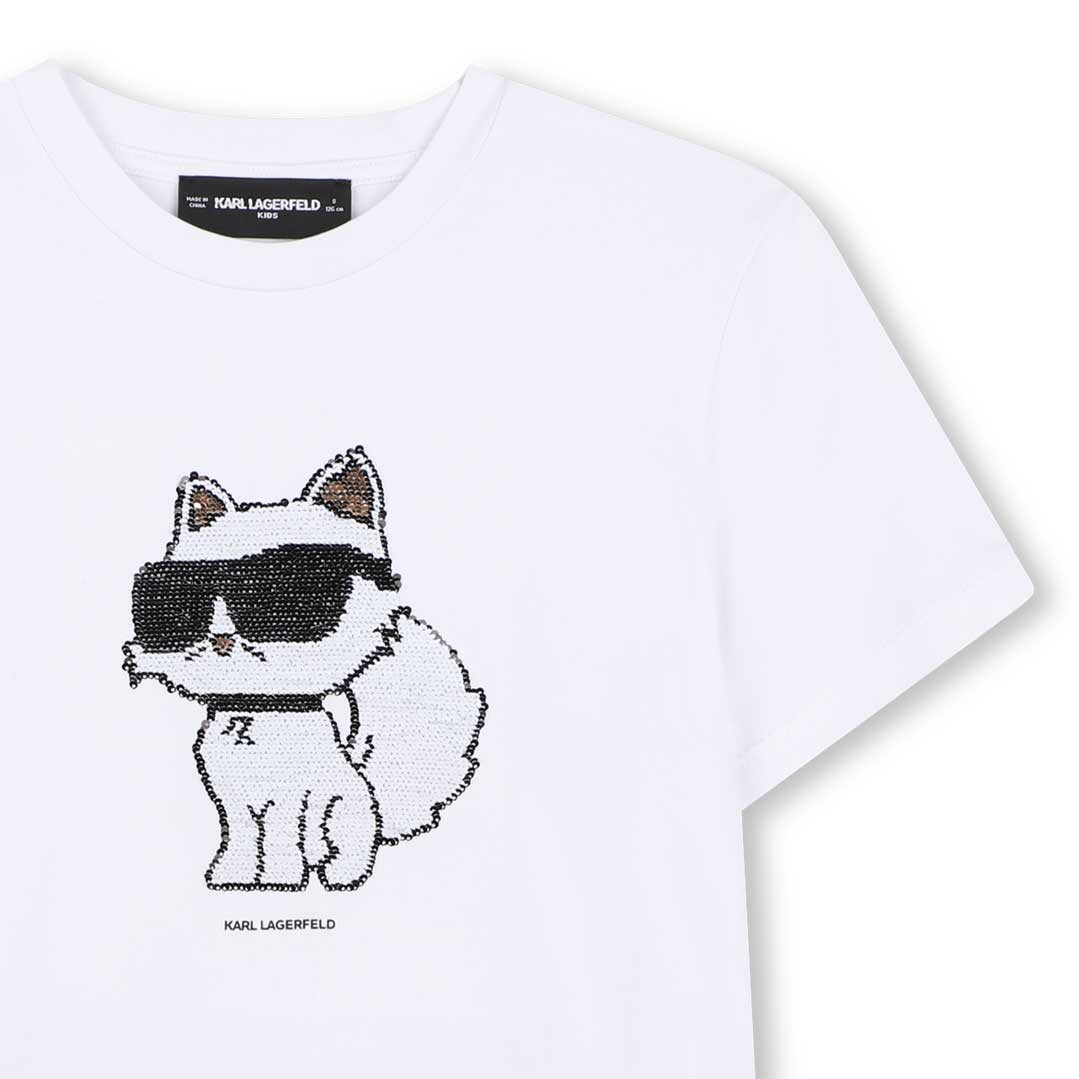 Biała koszulka dziewczęca Karl Lagerfeld Z31153 10P. T-shirt ozdobiony aplikacją 3D przedstawiającą kota.