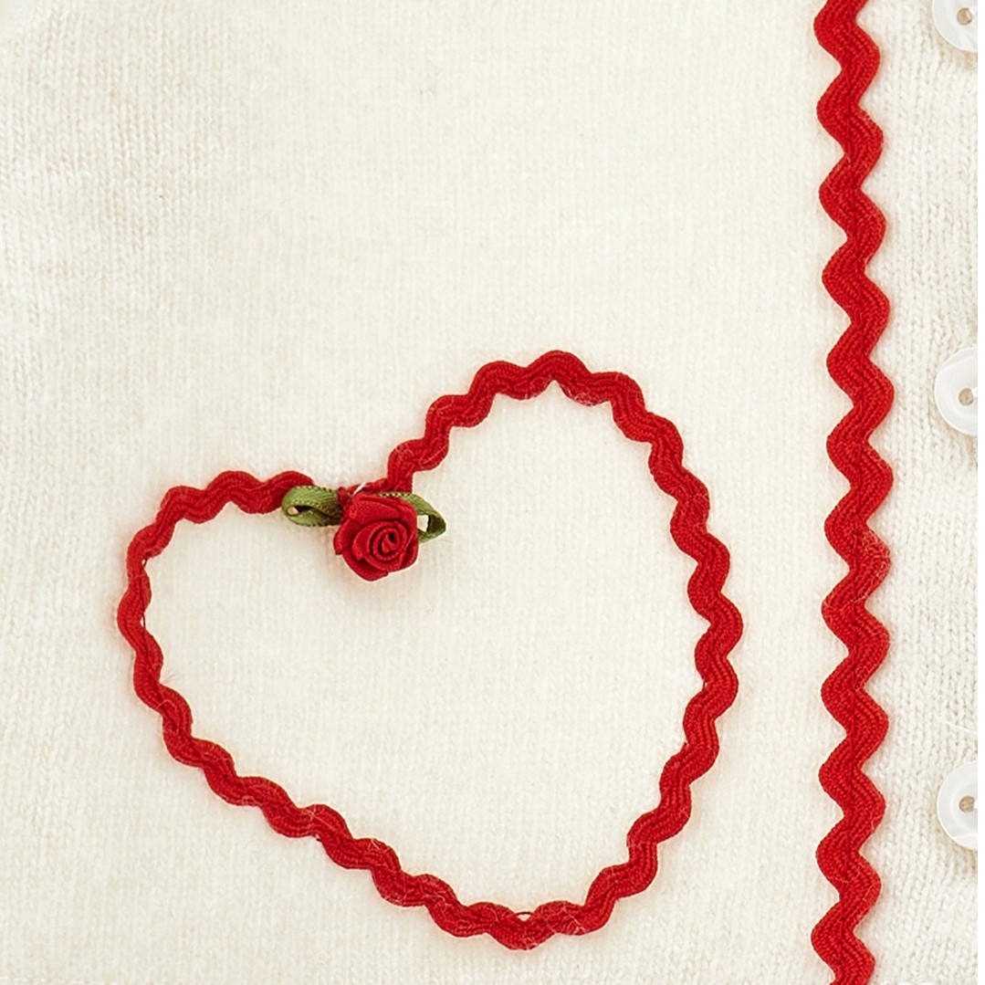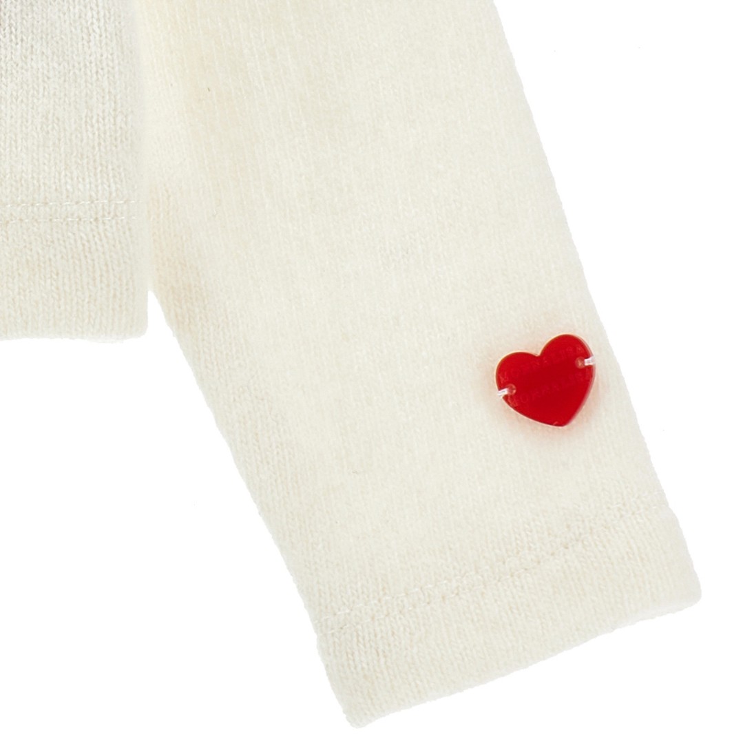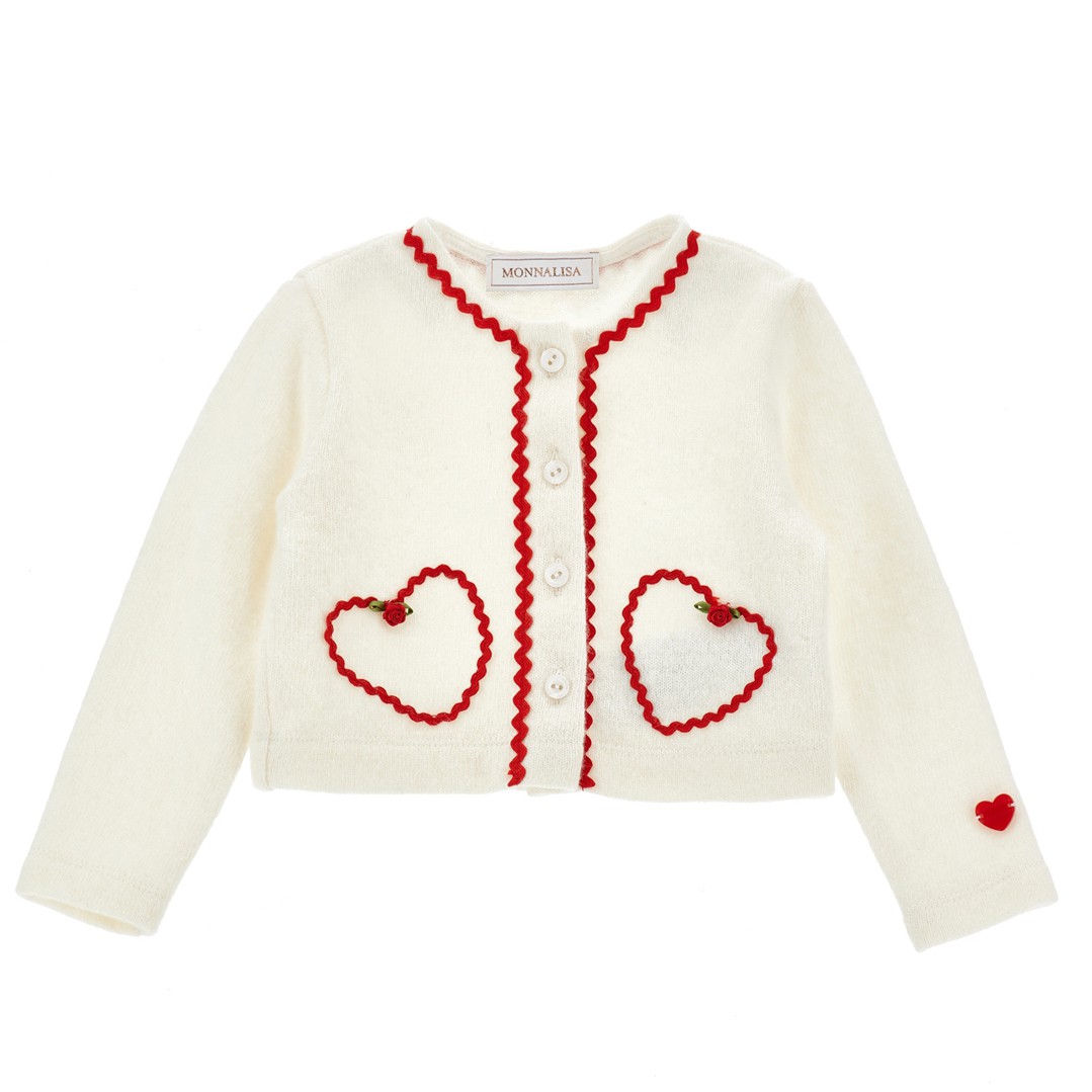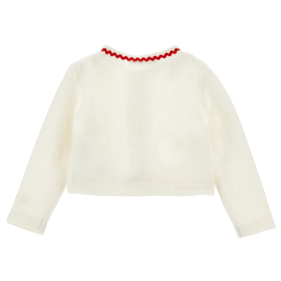 Ekskluzywny kardigan Monnalisa 31F805 6204 0002 dla małej dziewczynki wykonany z mieszanki wełny, kaszmiru, wiskozy. Jasny, zapinany na guziczki sweterek ozdobiony jest czerwonymi detalami. Kardigan 31F805 6204 0002 świetnie sprawdzi się w świątecznych stylizacjach.