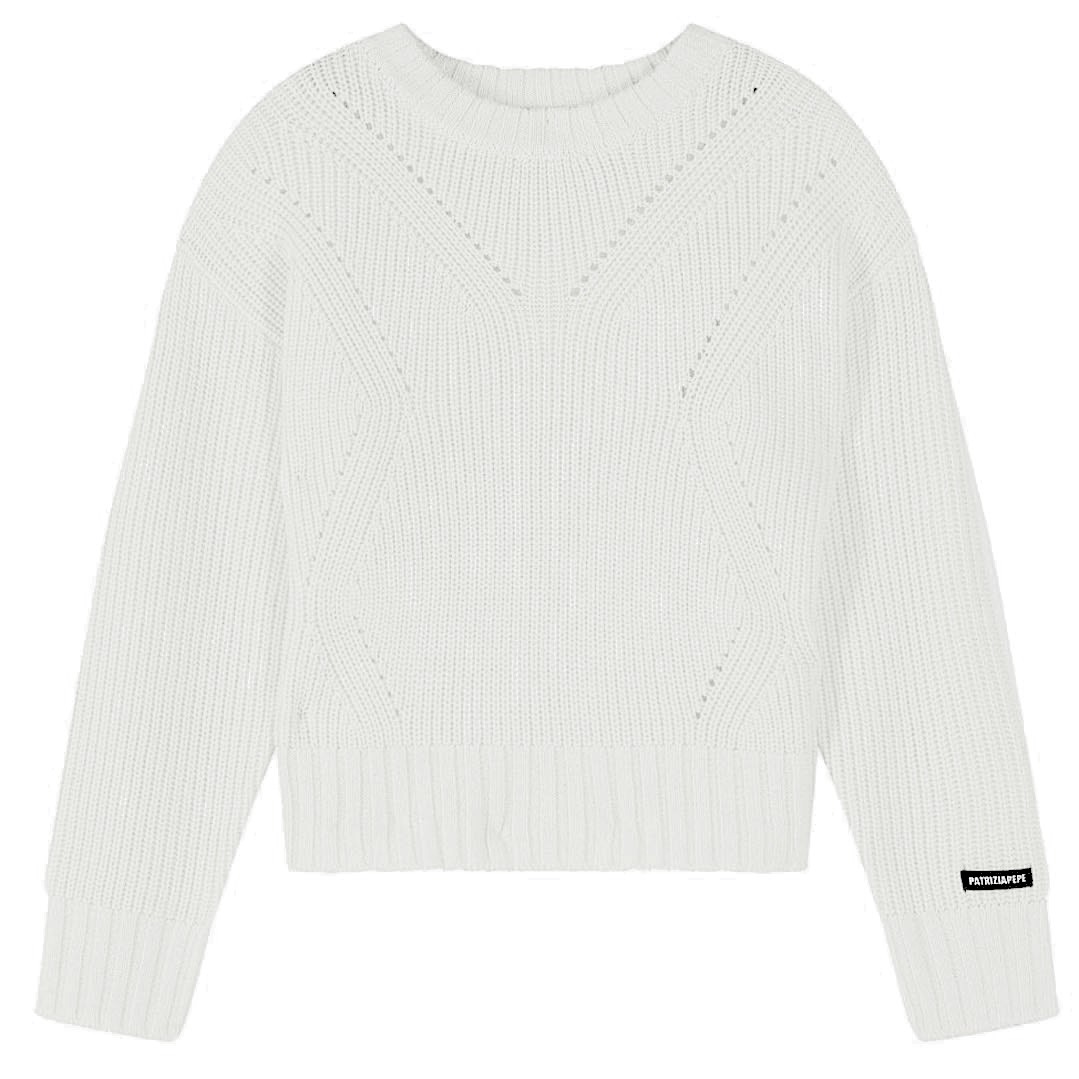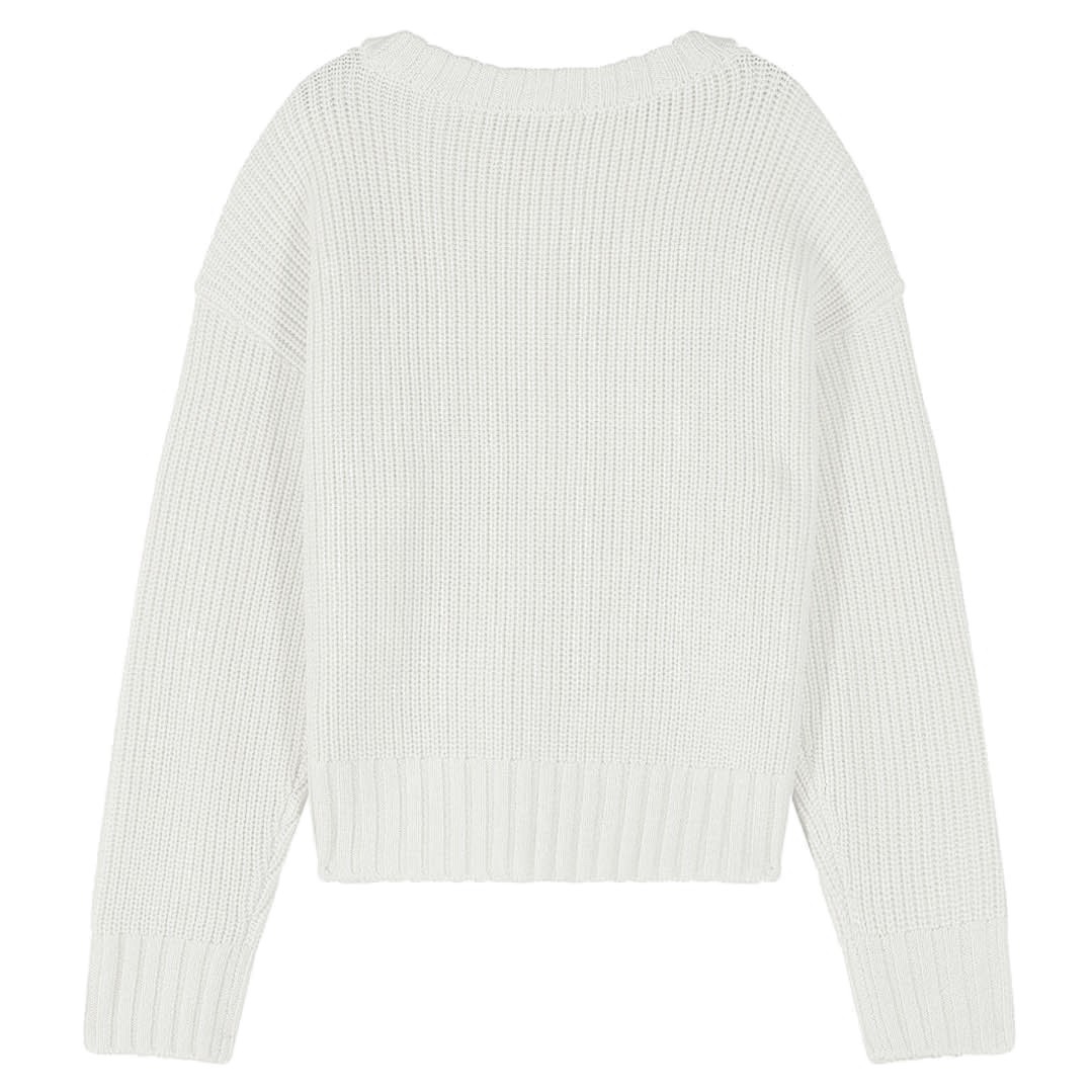 Jasny, kremowy sweter dla dziewczynki marki Patrizia Pepe, wykonany z miękkiej dzianiny o luźnym splocie. Obszerny fason i minimalistyczny styl idealny dla nastolatki.