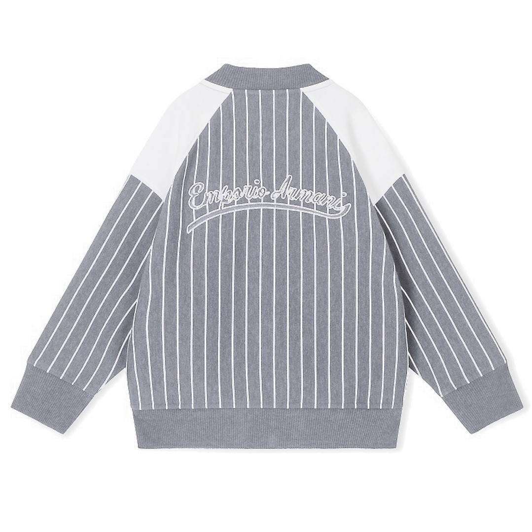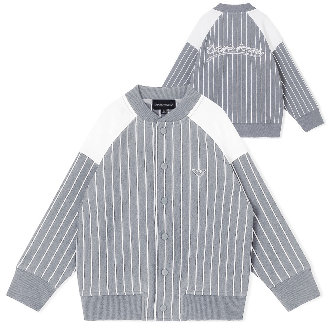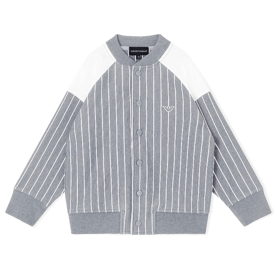Bluza chłopięca Emporio Armani EB001002 AF21874 O8035 dla dziecka w wieku od 4 do 16 lat. Bluza zapinana na napy, uszyta z szarej, melanżowej dzianiny bawełnianej z białymi wstawkami. Na plecach dziana stylizowana nazwa marki. Po bokach bluzy wsuwane kieszenie.