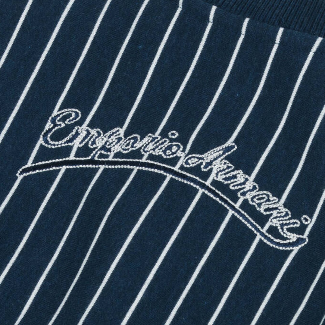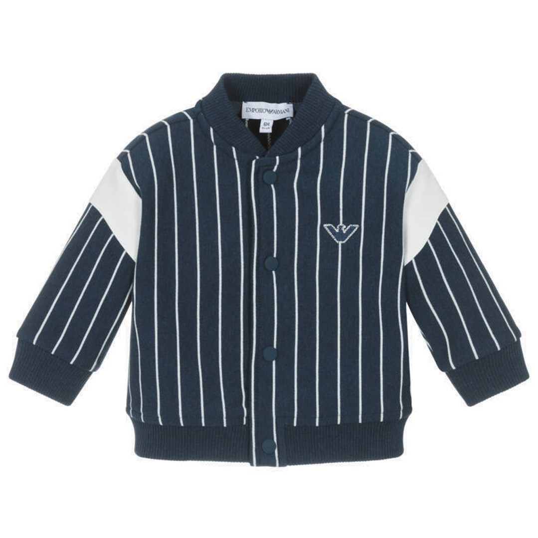 Zapinana na napy bluza niemowlęca dla chłopca w wieku od 6 miesięcy do 3 lat. Bawełniana bluza dla malucha Emporio Armani EB001098 AF21874 FB016 uszyta z ciemnoniebieskiej dzianiny w białe paski z białymi wstawkami. Na plecach fantazyjna aplikacja.