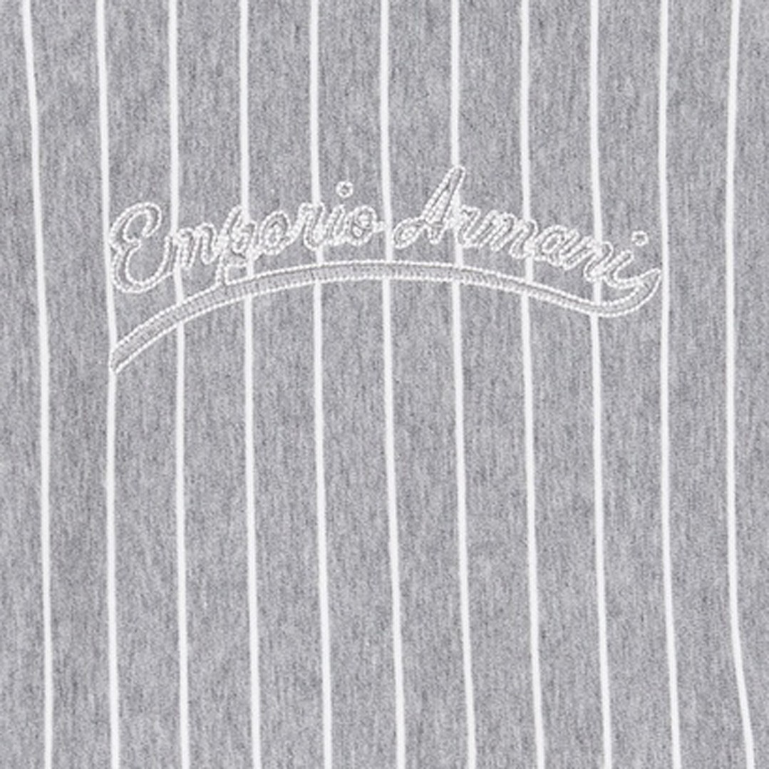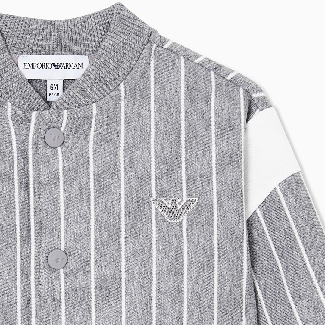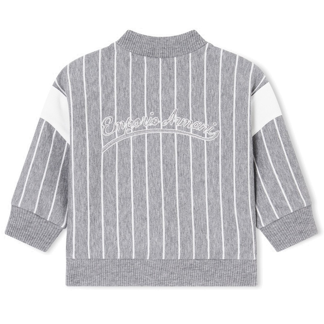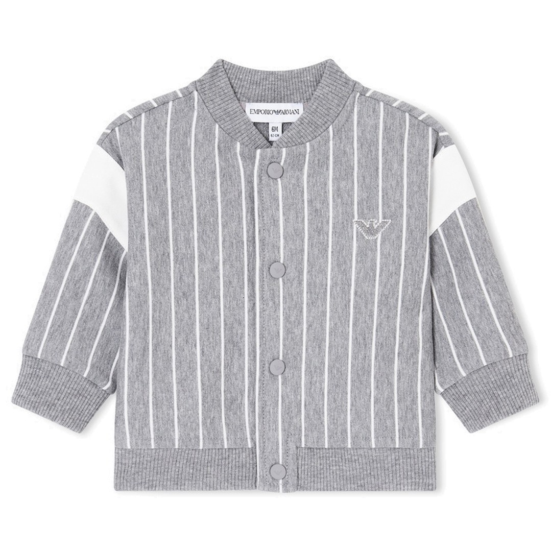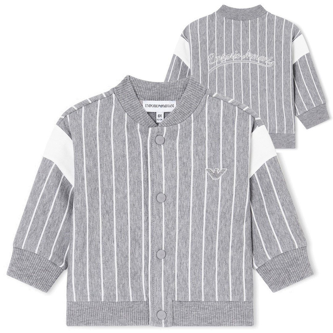 Bluza niemowlęca dla chłopca w wieku od 6 do 36 miesięcy. Zapinana na napy, bawełniana bluza dla chłopczyka Emporio Armani EB001098 AF21874 O8035. Bluza uszyta z szarej melanżowej dzianiny w białe paski. Na plecach fantazyjne logo marki.