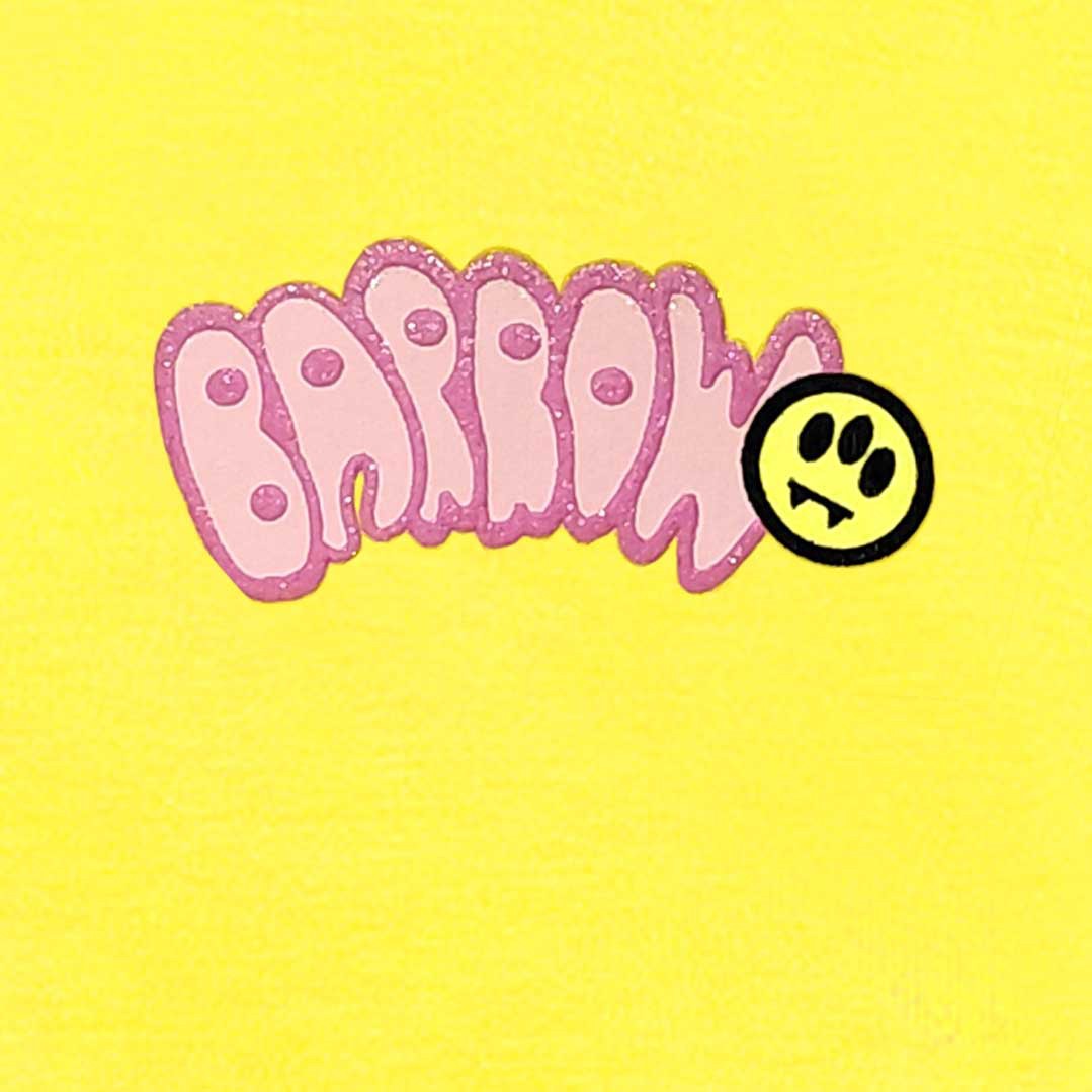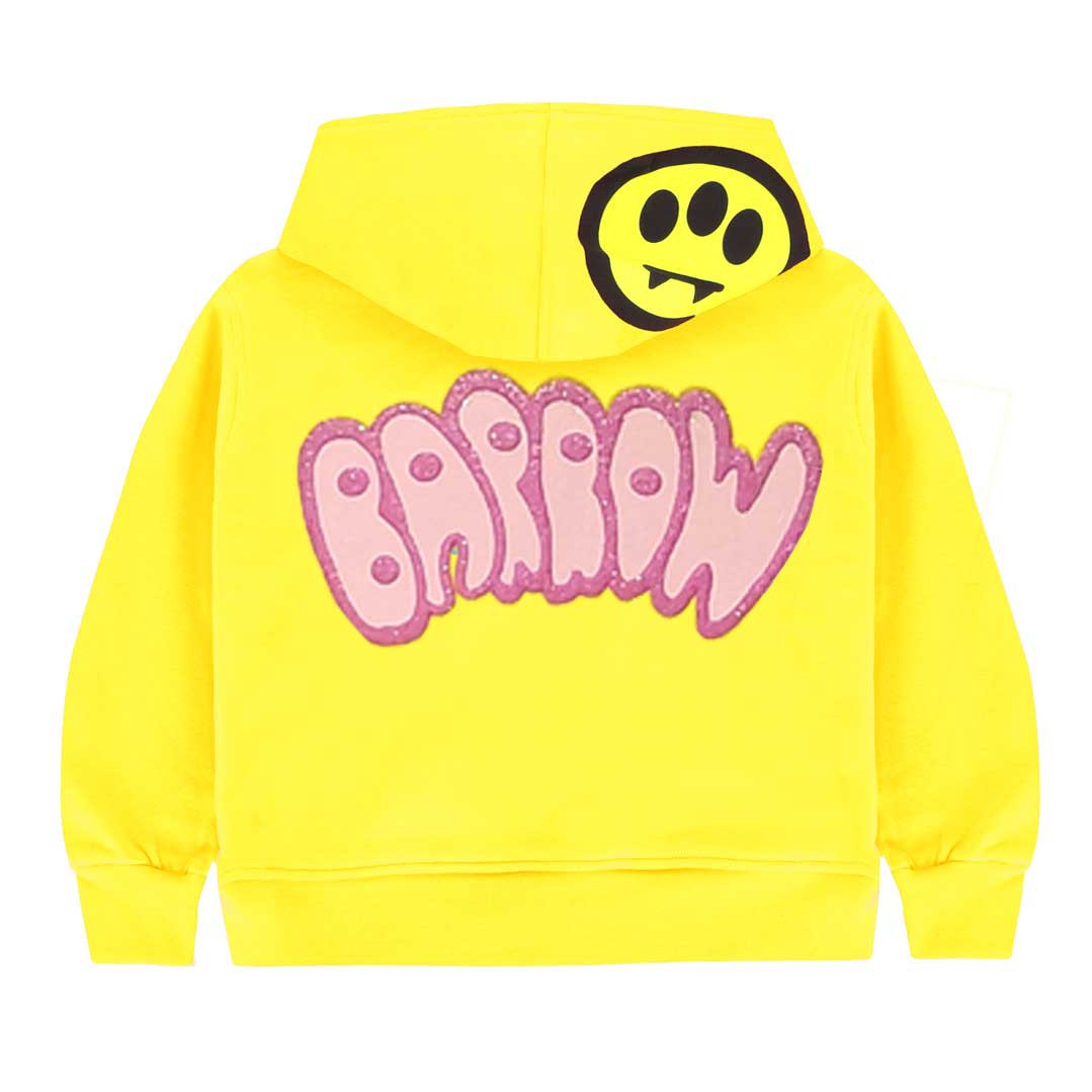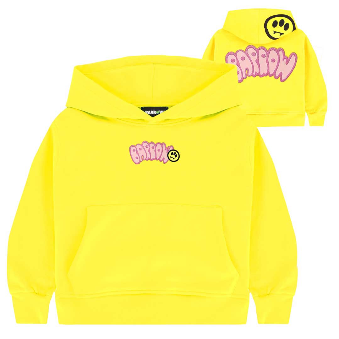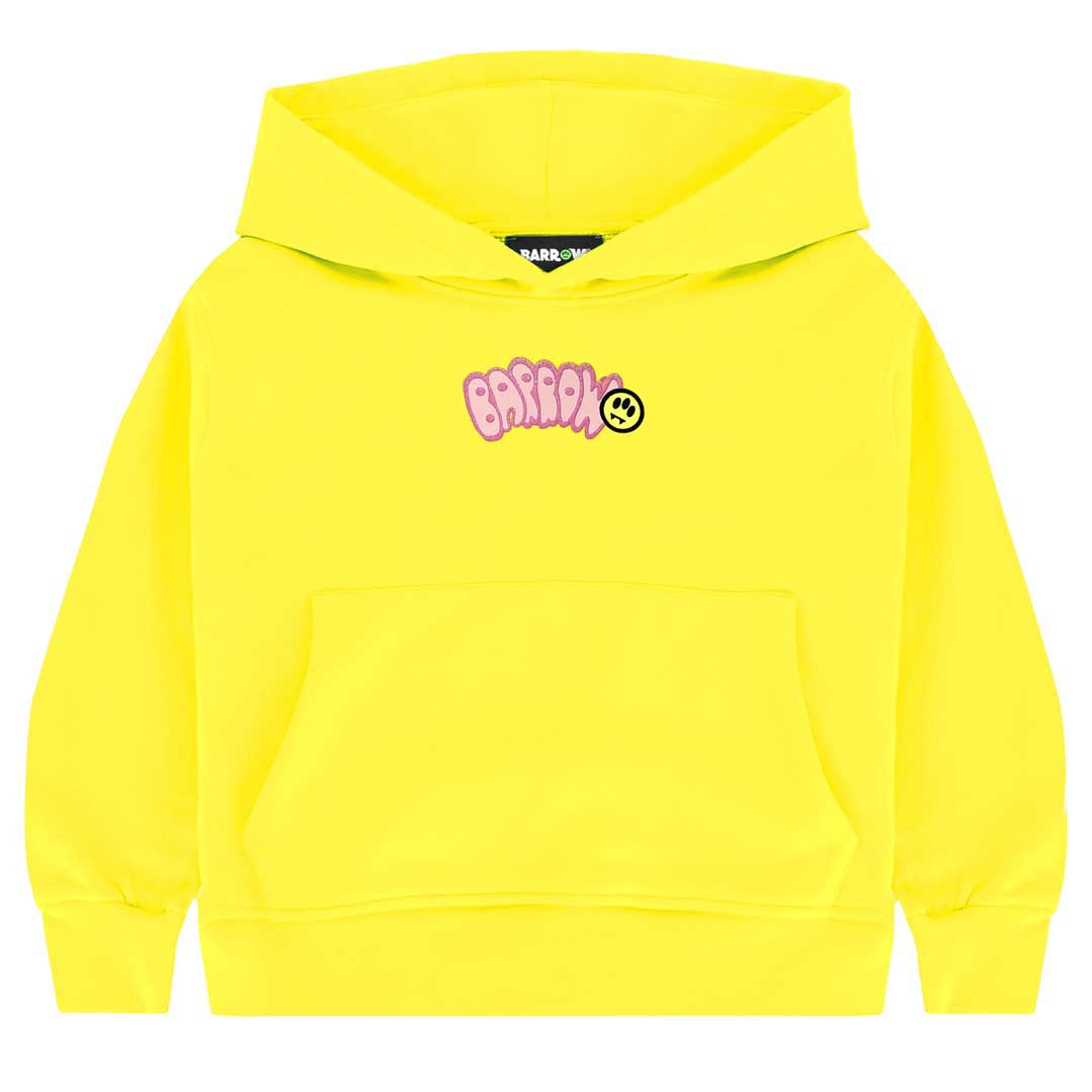 Bawełniana bluza dla dziewczynki Barrow S6BKJGHS004 BW317, wykonana z dzianiny w jaskrawym, żółtym kolorze, ozdobina różowym nadrukiem. Model z kapturem i kieszenią typu kangur.