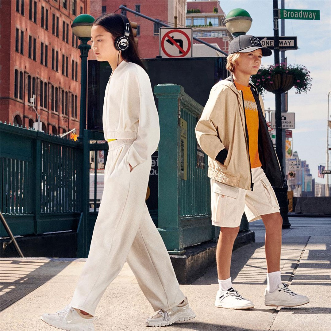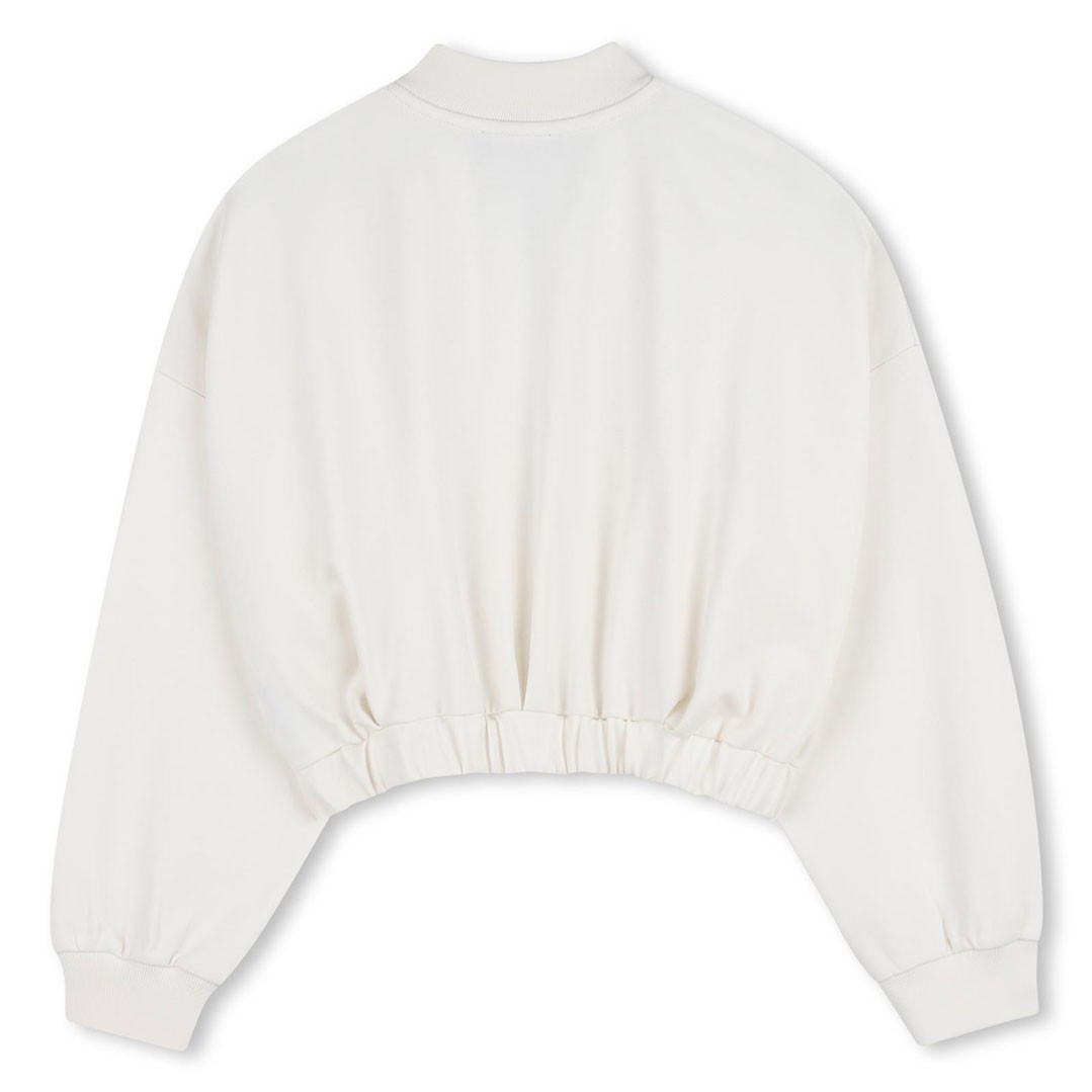 Zapinana na suwak, jasna bluza dziewczęca DKNY D62571 519. Krótki, obszerny fason doskonale prezentuje się ze spodniemi DKNY.