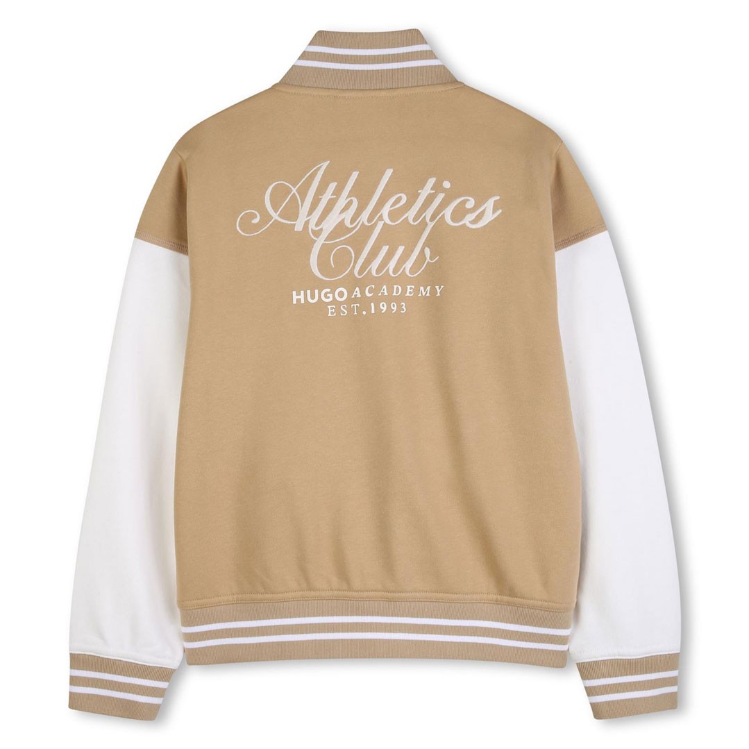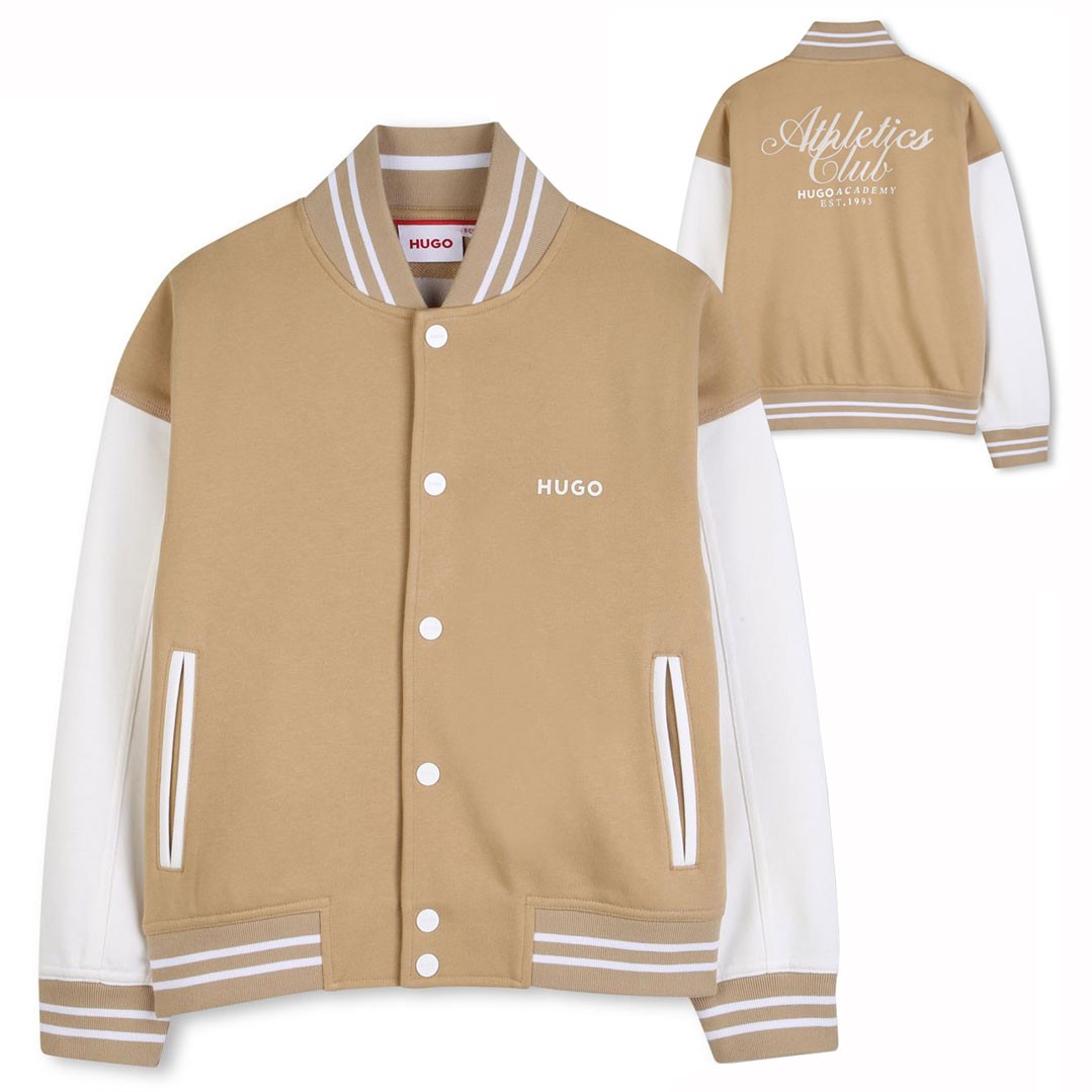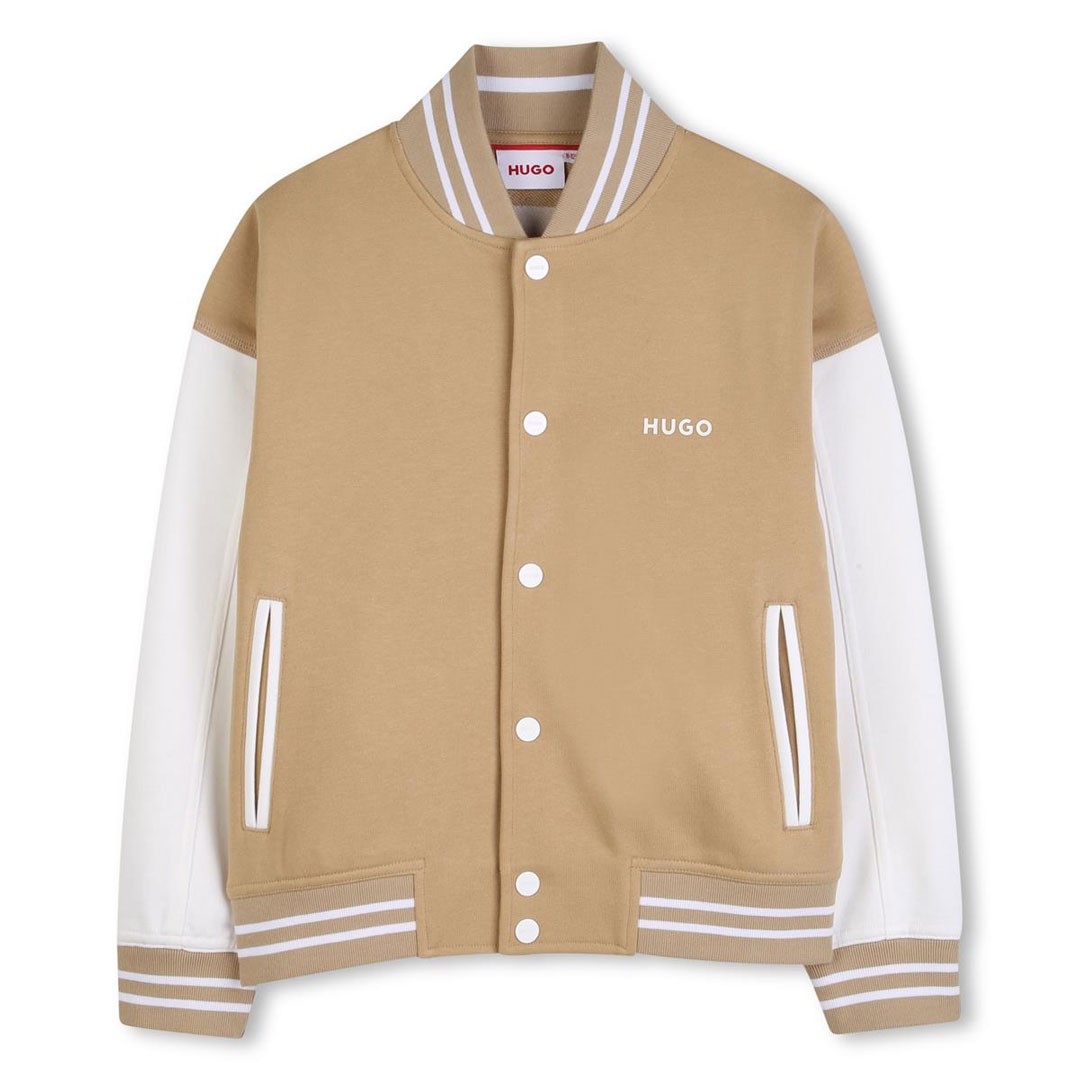 Bluza chłopięca Hugo G01003 23B uszyta z miękkiej dzianiny w karmelowym kolorze z jasnymi rękawami. Bluza zapinana na jasne napy z aplikacją na plecach i wsuwanymi kieszeniami.