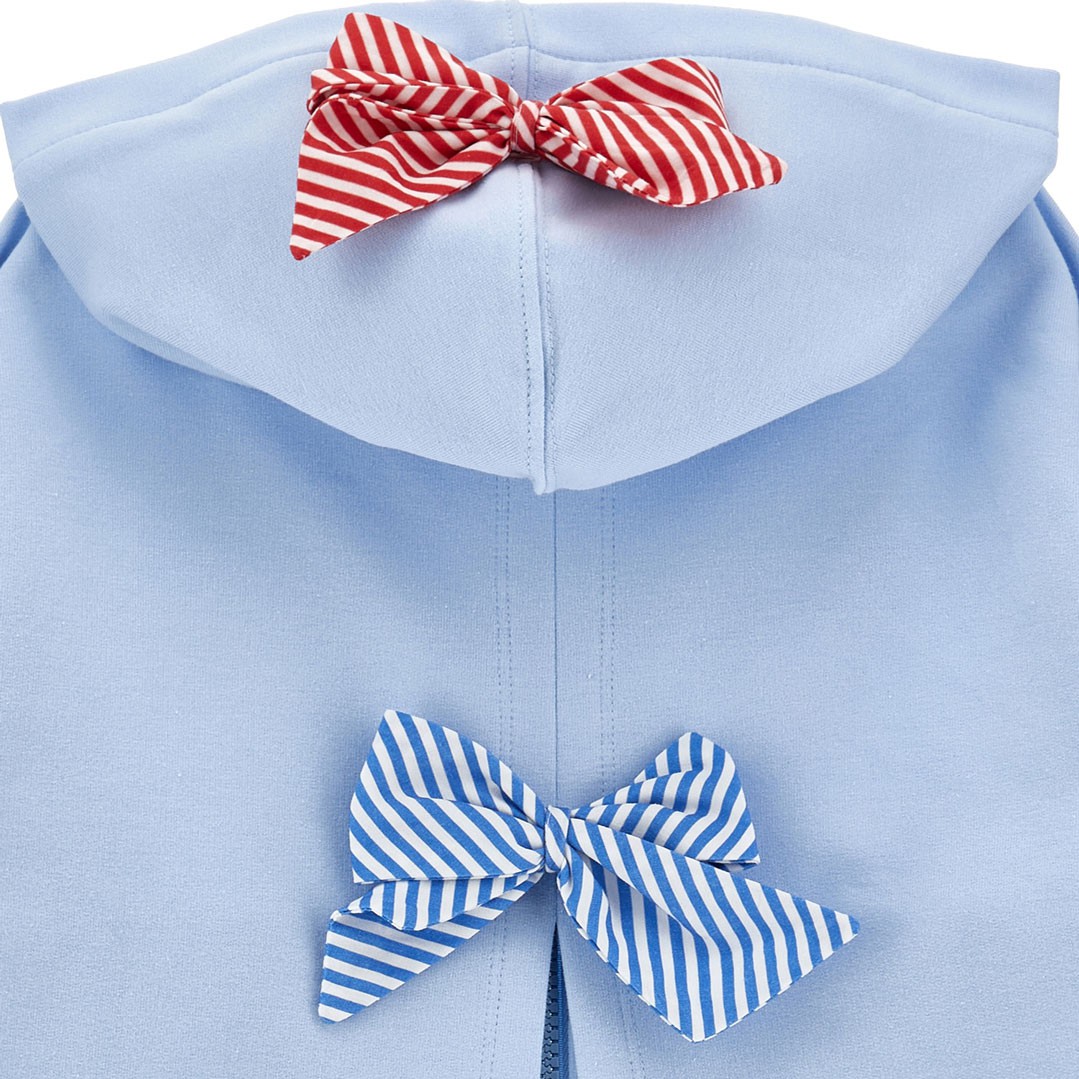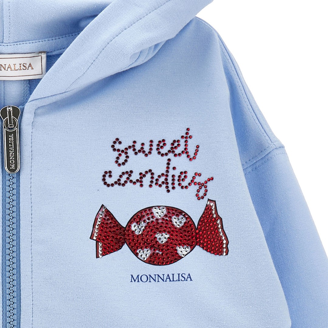 Zapinana na suwak dziewczęca bluza z kapturem Monnalisa 19G803 7012 0058. Oryginalna bluza uszyta z błękitnej, bawełnianej dzianiny z dwoma wpuszczanymi kieszeniami i pęknięiem na plecach. Na piersi wysadzana czerwonymi kryształkami aplikacja. Kaptur ozdobiony dwoma kokardkami w paski. Do bluzy dziewczecej Monnalisa 19G803 7012 0058 idealnie pasują sportowe spodnie 19G406, które z bluzą 19G803 7012 0058 mogą tworzyć kompletny dres.