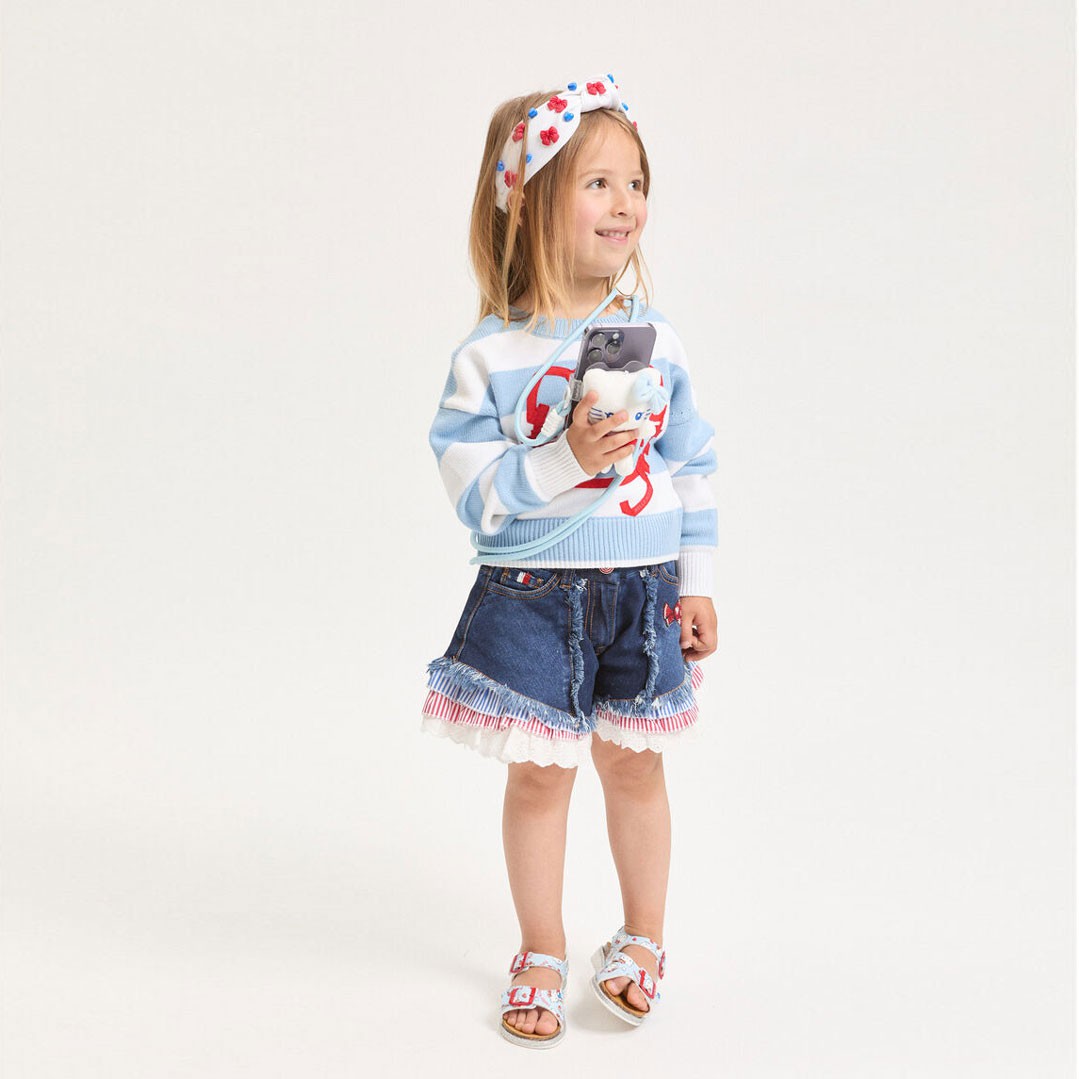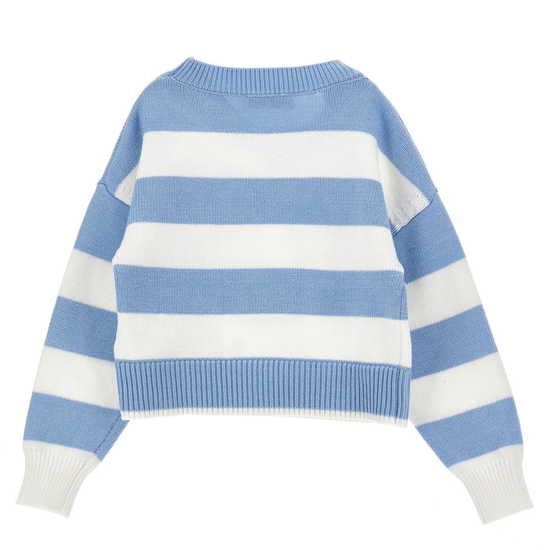 Przyjemny w dotyku sweter dziewczęcy Monnalisa 19G606 7029 5899. Obszerny model w biało-niebieskie poprzeczne pasy, ozdobiony stylizowanym portretem Hello Kitty wykonanym kontrastującą, czerwoną taśmą.
