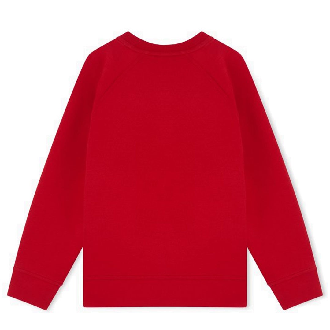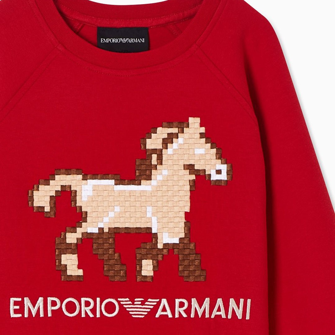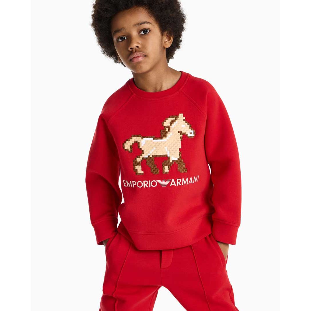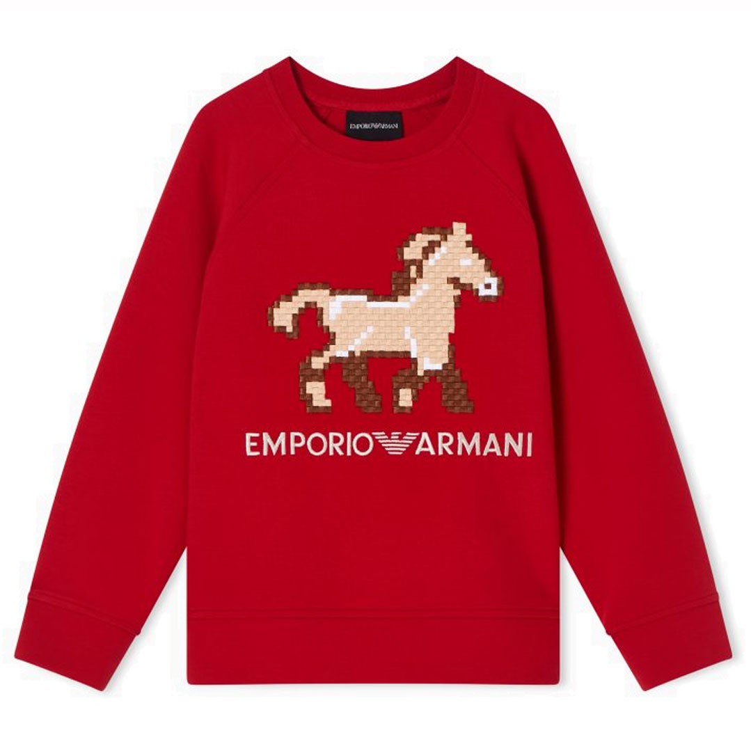 Czerwona bluza chłopięca Emporio Armani EB000915 AF10126 U5067. Bluza uszyta z miękkiej dzianiny w jaskrawym kolorze. Przód ozdobiony jest aplikacją przedstawiającą konia. Aplikacja wykonana jest techniką przypominającą haft krzyżykowy.