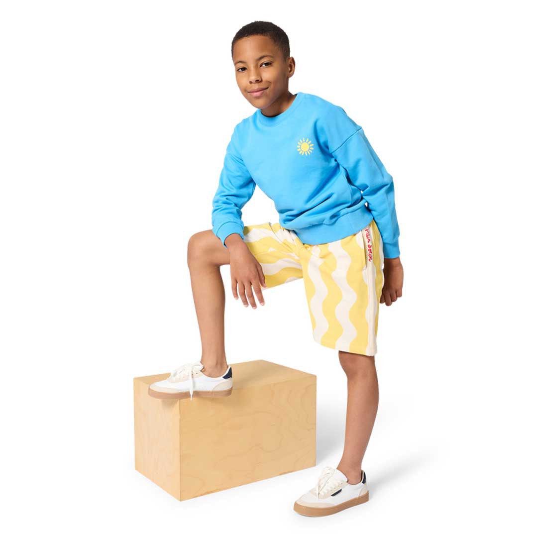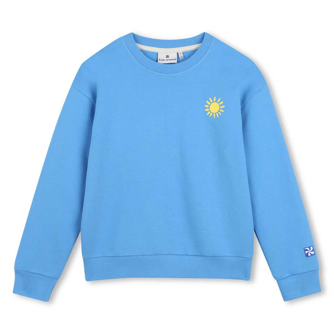 Niebieska bluza dla chłopca Kids Around L00016 78E. Z przodu niewielki nadruk, na plecach duża aplikacja frotte.