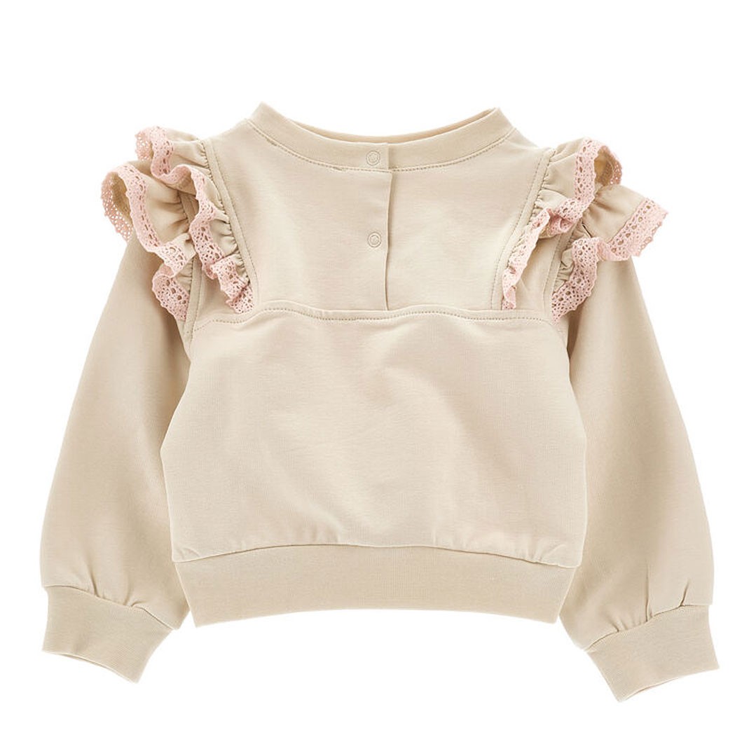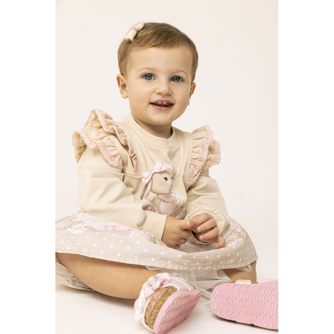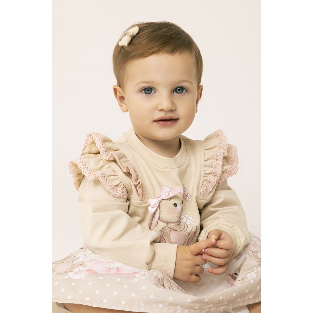 Bluza niemowlęca dla dziewczynki Monnalisa 39G607 7007 0002 uszyta z beżowej dzianiny z dodatkami w kolorze różu i nadrukiem uroczego króliczka.