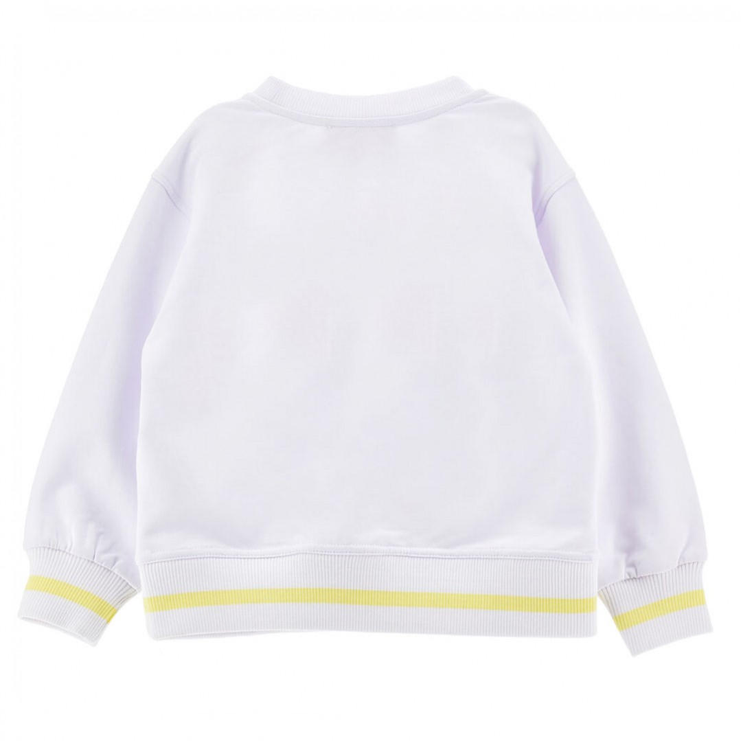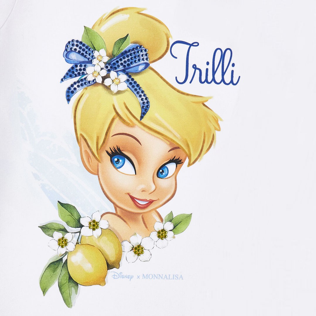 Biała bluza dla dziewczynki Monnalisa 19G619 7031 0099 z linii Bimba Main Trilli, uszyta z przewiewnej bawełnianej dzianiny z dodatkiem elastanu, ozdobiona nadrukiem przedstawiającym Portret Trilli, bajkowego Dzwoneczka. Ściągacze ozdobione pastelowym, żółtym paseczkiem.