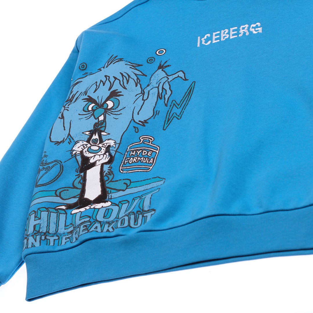 Bluza chłopięca Iceberg MFICE6100J AZ wykonana z mieszanki bawełny w intensywnym niebieskim kolorze. Bluza zakładana przez głowę z kapturem o obszernym kroju over fit. Przód ozdobiony zabawnym nadrukiem.