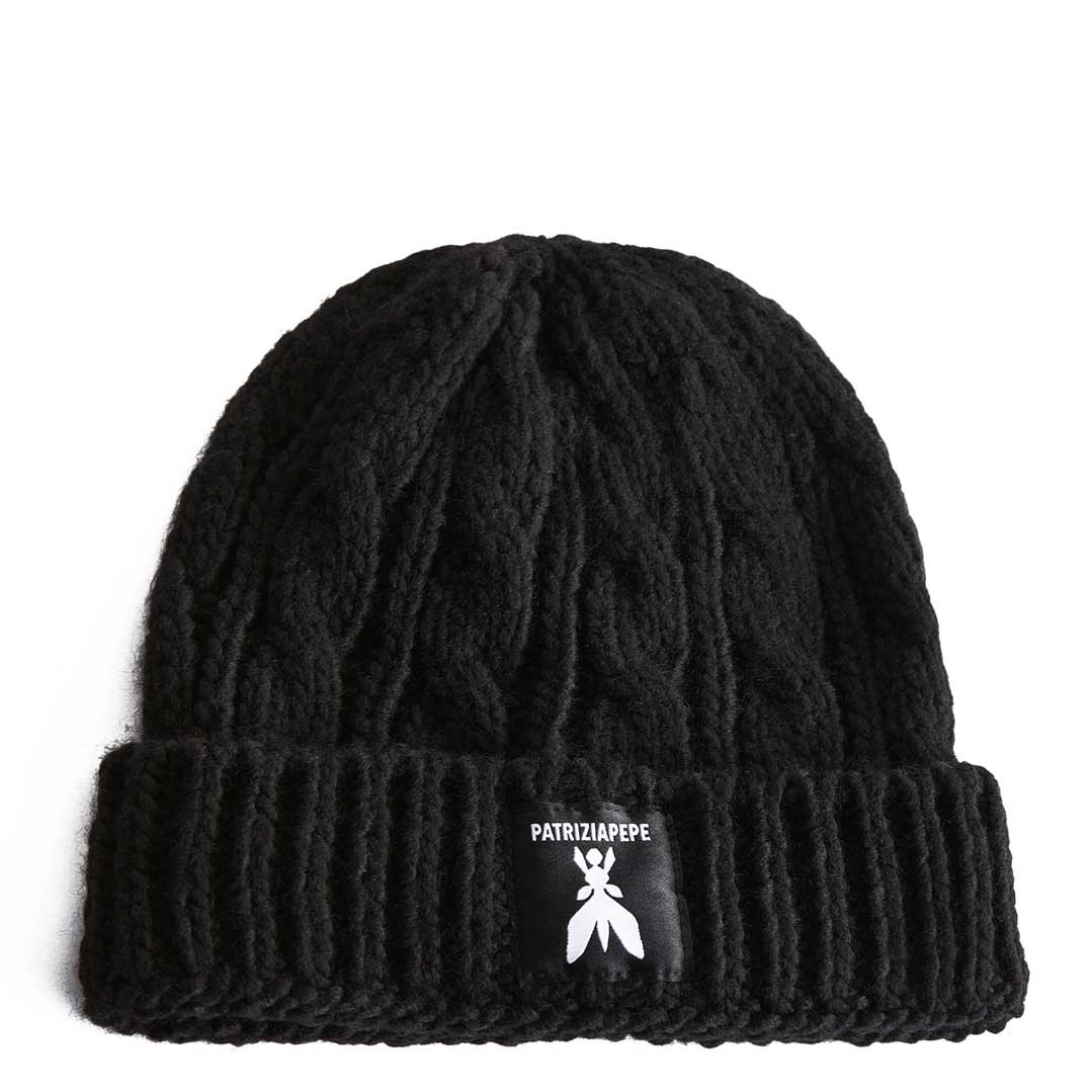 Czapka dziewczęca Patrizia Pepe 7F0018, wykonana z czarnej, miękkiej przędzy dzianej we wzór warkoczy. Rozmiar uniwersalny, zgodnie z deklaracją producenta dla dziewczynki w wieku 6 - 16 lat.