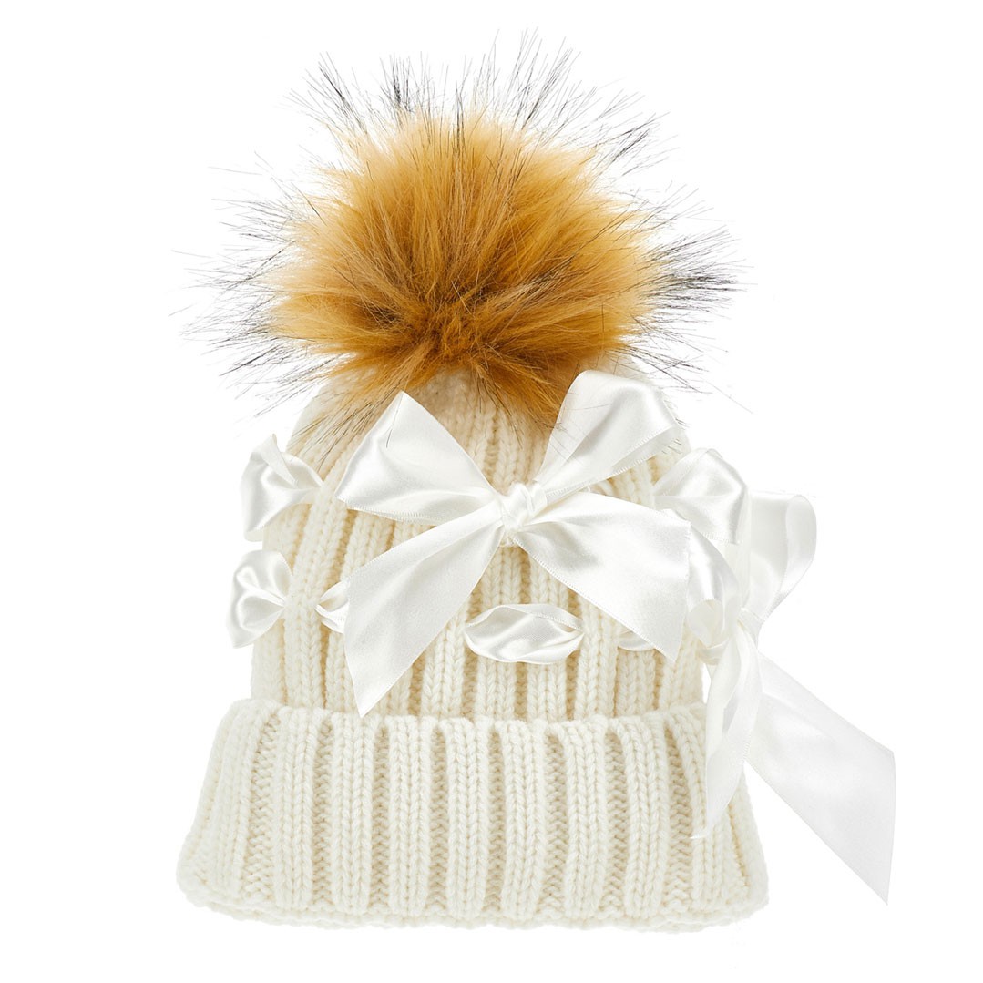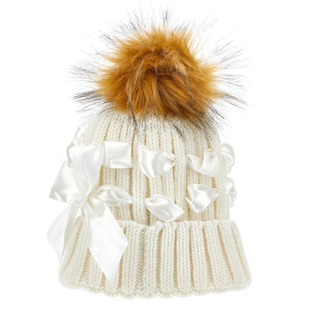 Zimowa czapka dla dziewczynki Monnalisa 17F006 6063 0001, wykonana z jasnej dzianiny, ozdobiona kokardami i pomponem. Klasyczny fason z wywiniętym mankietem.