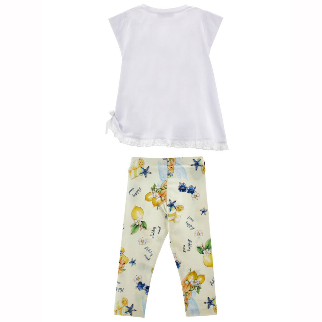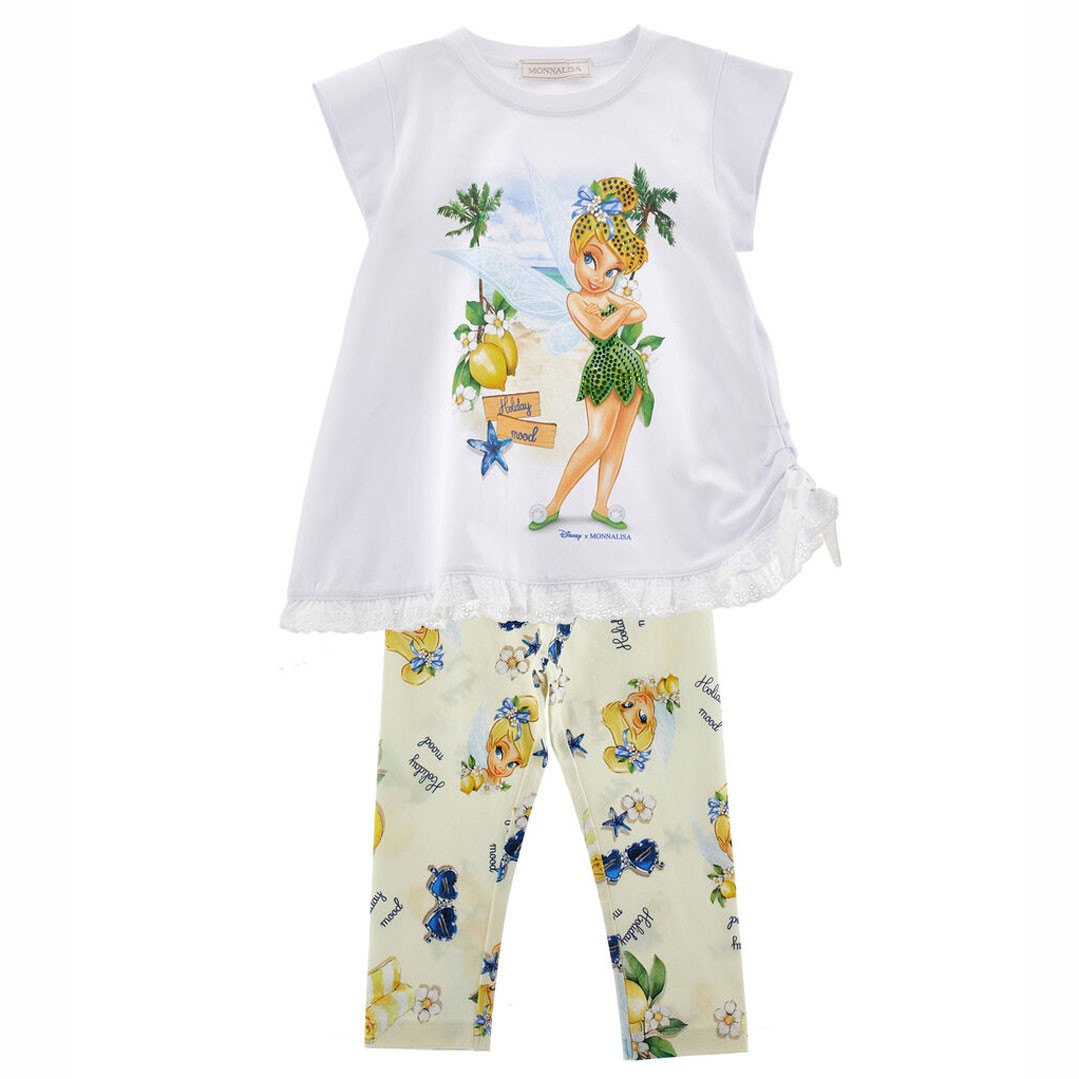 Wygodny zestaw odzieżowy dla dziewczynki Monnalisa 19G506 7032 9914 składający się z drukowanych legginsów i koszulki maxi. Koszulka o trapezowym fasonie i elastyczne legginsy zapewniają wygodę i swobodę ruchów. Przód koszulki i nadruk na legginsach inspirowany jest bohaterką dziecięcych bajek, towarzyszką Piotrusia Pana, wróżką o imieniu Dzwoneczek.