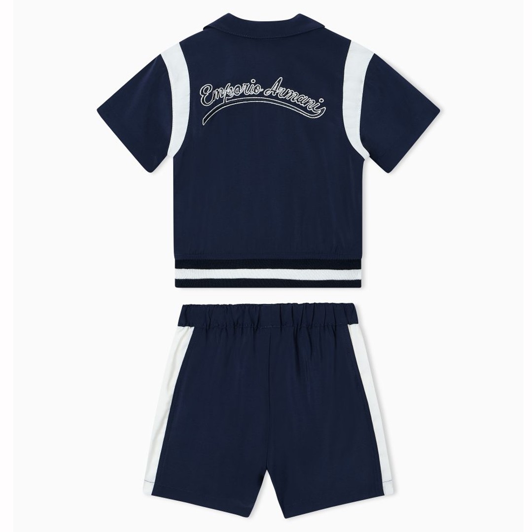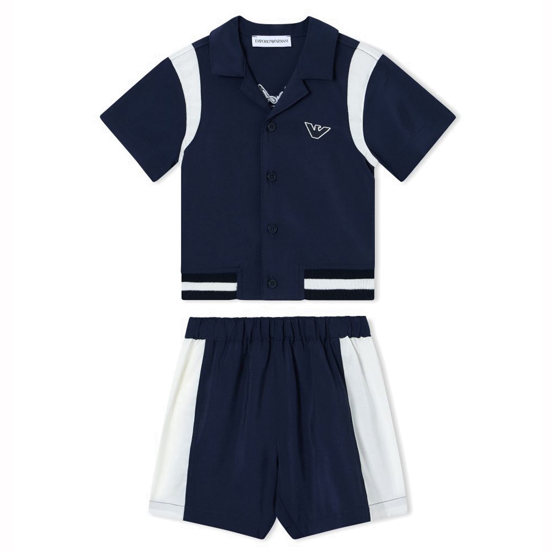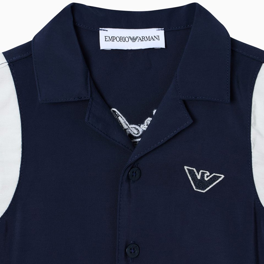 Piękny, przewiewny komplet dla chłopca Emporio Armani EB001115 AF20699 MB569. Komplet w ciemnoniebieskim kolorze z detalami w kontrastującej bieli, składa się z krótkich spodenek i zapinanej na guziczki koszuli, która zakończona jest ściągaczem. Komplet dobrze prezentue się również z rozpiętą górą noszoną w zastępstwie bluzy. Komplet uszyty z bardzo delikatnej tkaniny wiskozowej, doskonały na letnie upały.