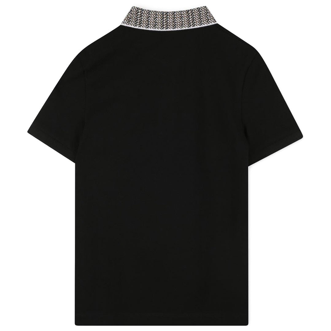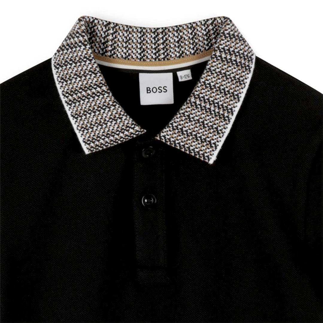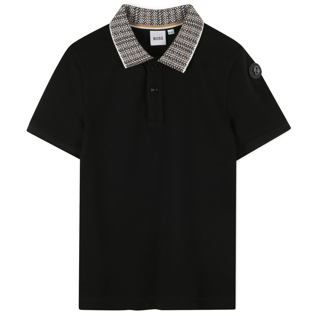 Czarna, chłopięca koszulka polo z krótkim rękawem Hugo Boss J52341 09B uszyta z bawełny pique. Model minimalistyczny ozdobiony jedynie oryginalnym kołnierzykiem i dyskretnym logo na ramieniu.