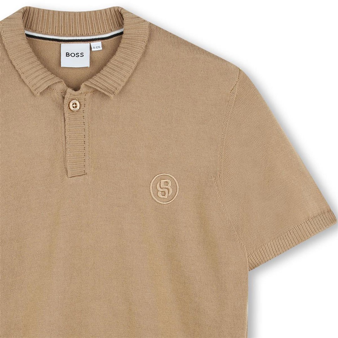 Chłopieca koszulka polo z krótkim rękawem Hugo Boss J52342 269 wykonana z bawełnianej dzianiny przypominajacej bardzo cienki sweterek. Model minimalistyczny w karmelowym beżu.