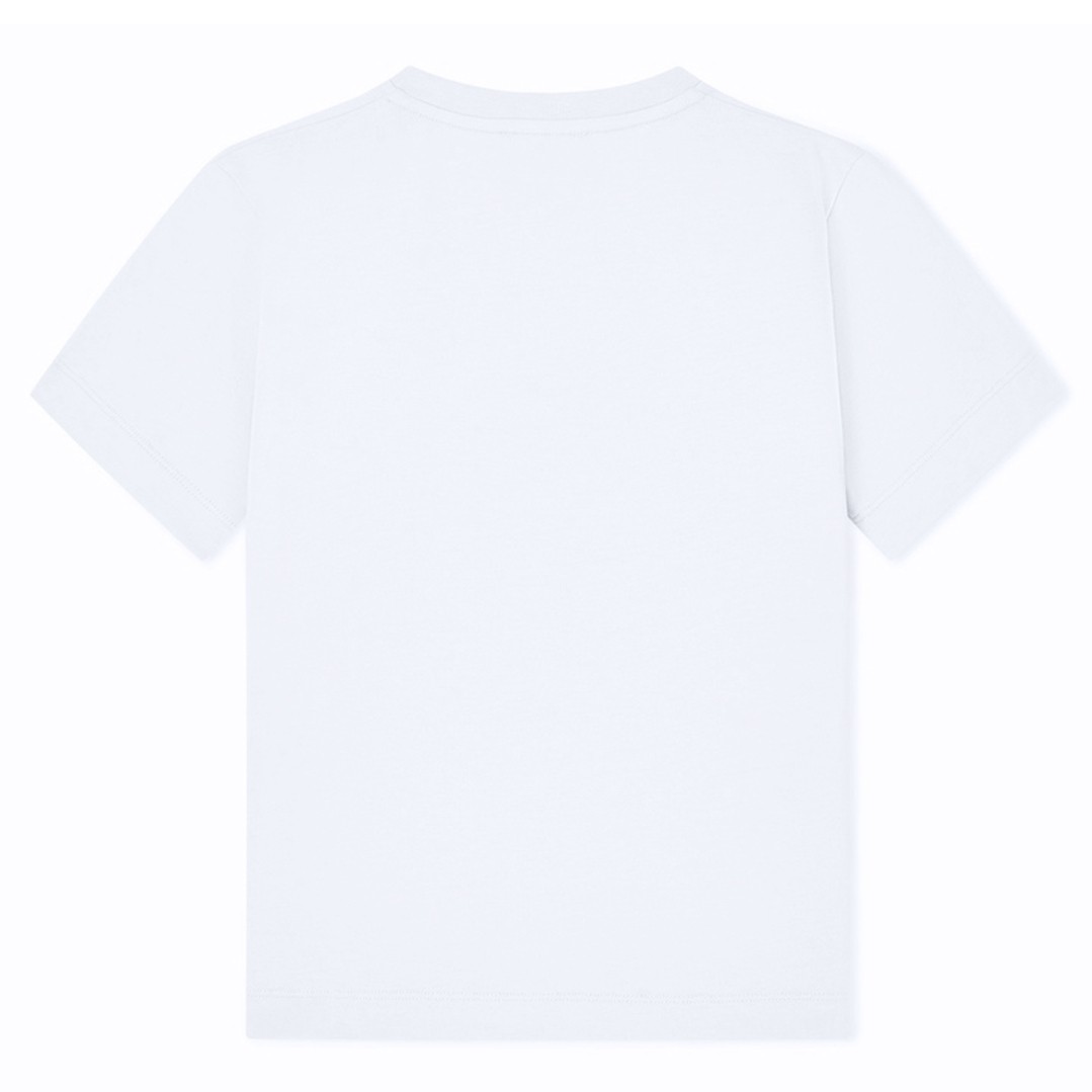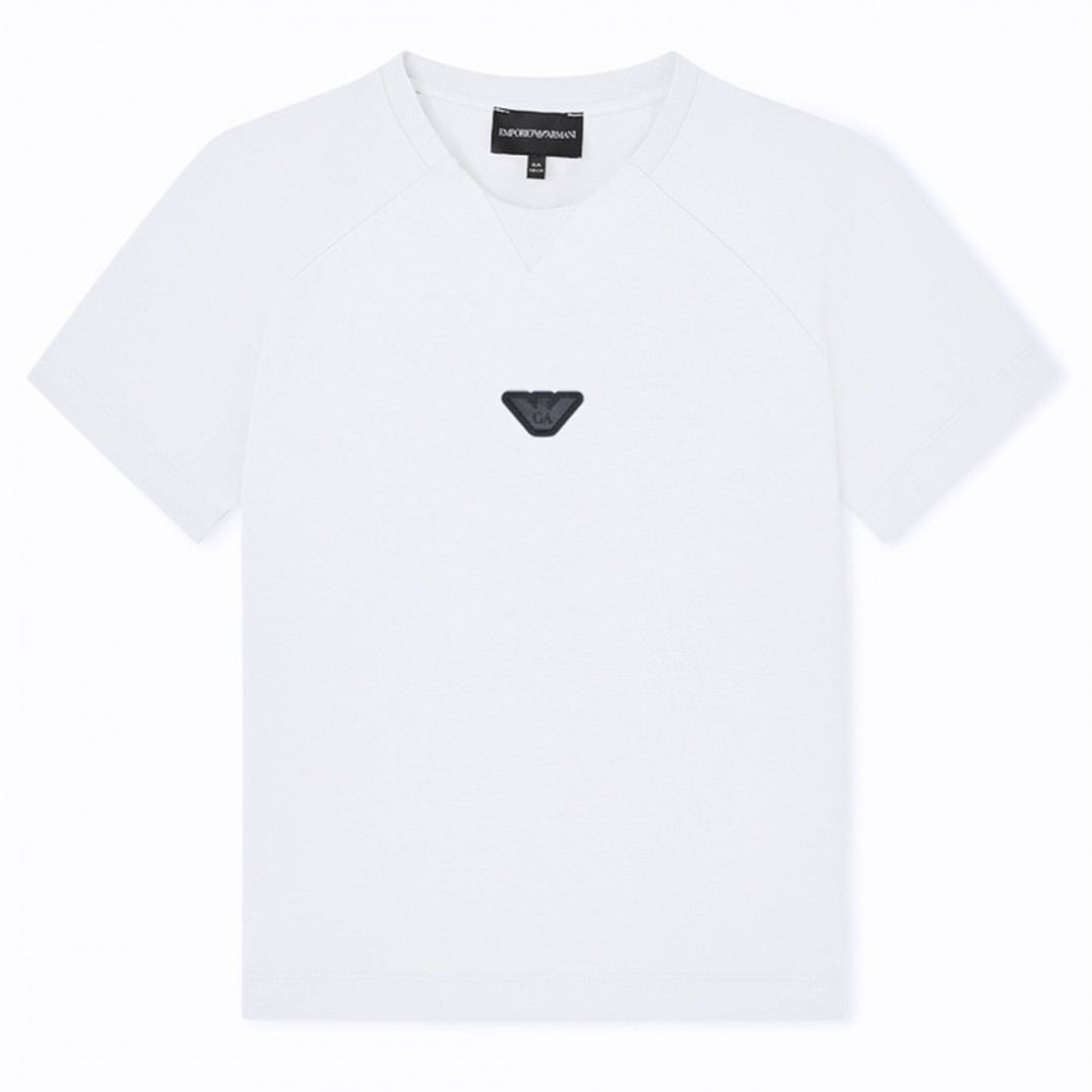 Biały, bawełniany t-shirt dla chłopca Emporio Armani EB000943 AF13715 U0003. Koszulka w minimalistycznym stylu z reglanowymi rękawami.
