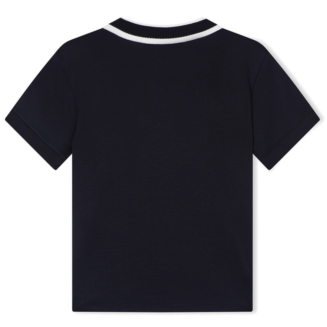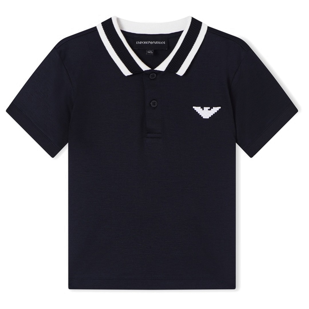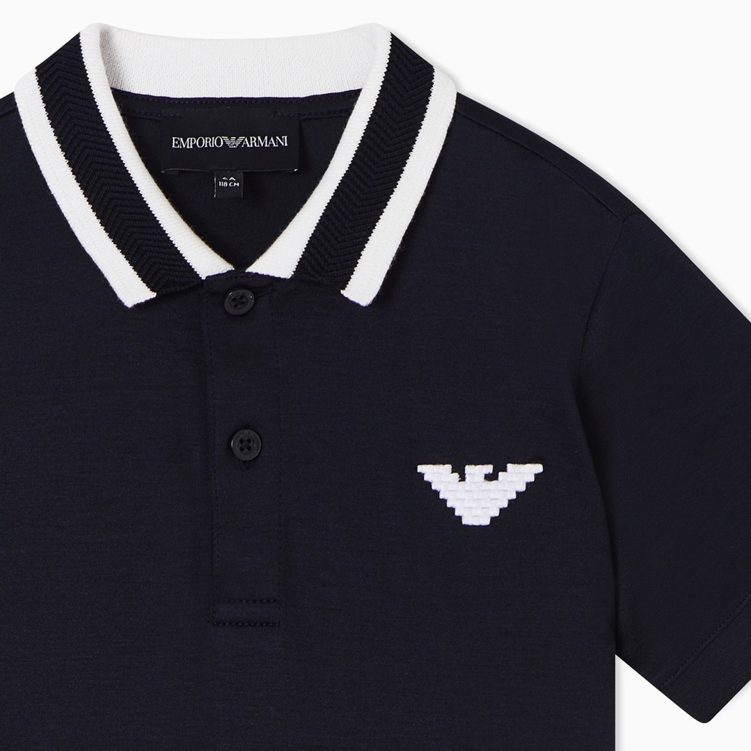 Granatowa koszulka polo dla chłopca Emporio Armani EB000910 AF10127 UB118. Detale w białym kolorze. Polo z doskonałej jakości dzianiny z mieszanki lyocelu i bawełny.