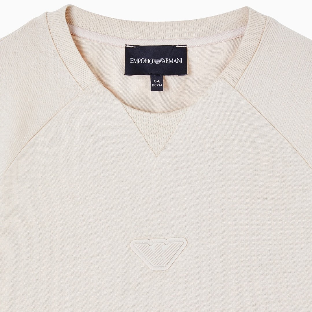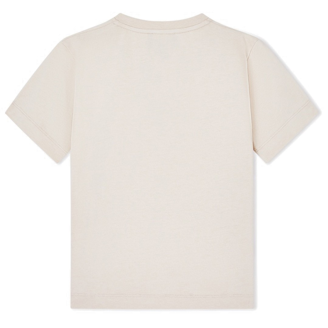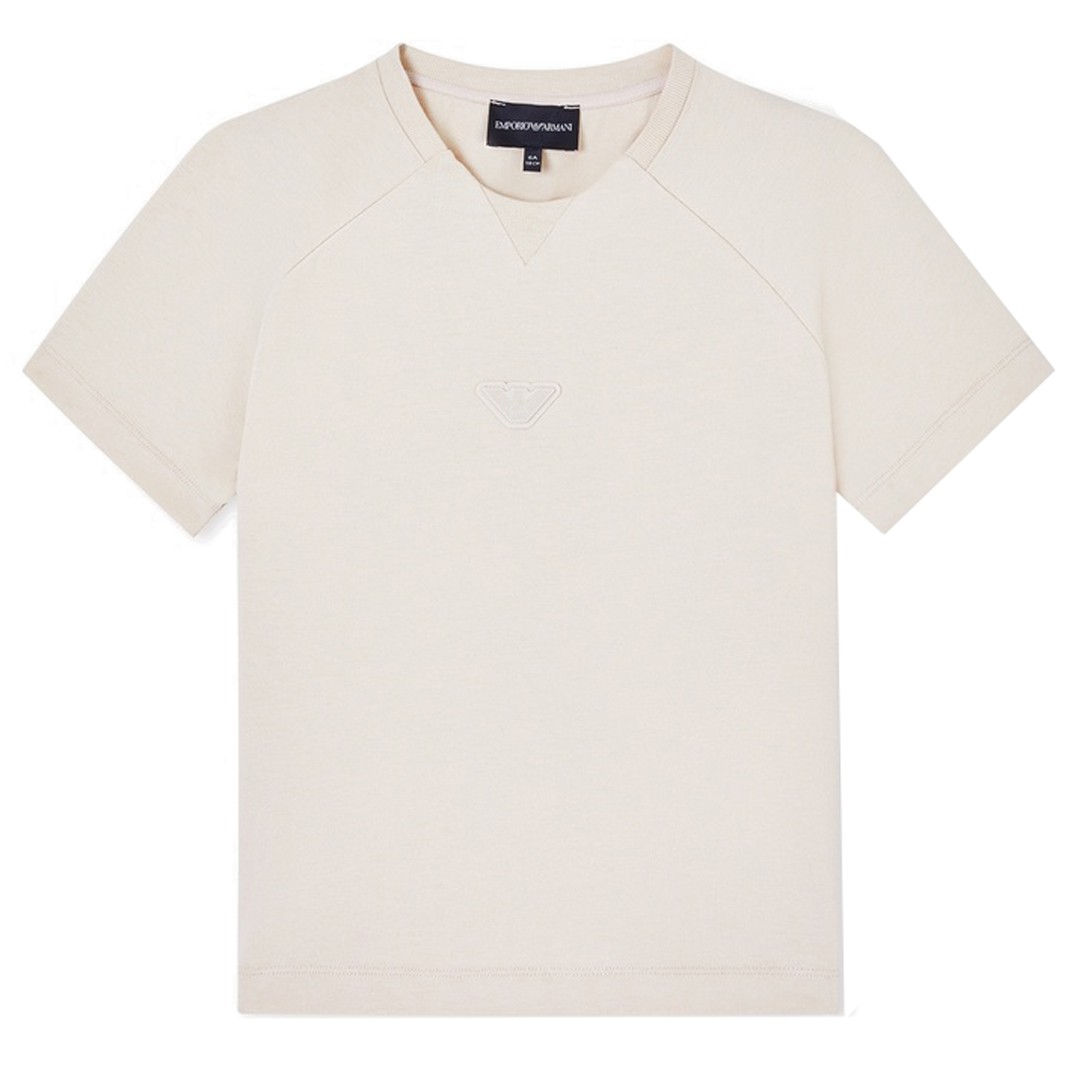 Beżowy, bawełniany t-shirt dla chłopca Emporio Armani EB000943 AF13715 U1156. Koszulka w minimalistycznym stylu z oryginalnym wykończeniem pod szyją i z reglanowymi rękawami.
