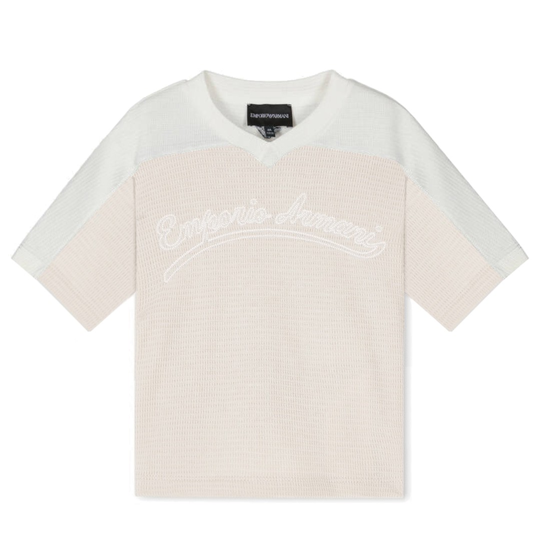 T- shirt dla chłopca Emporio Armani EB000946 AF21879 U1156. Koszulka uszyta z bawełnianych dzianin o oryginalnej fakturze w dwóch kolorach: ciepłym białym i beżowym.