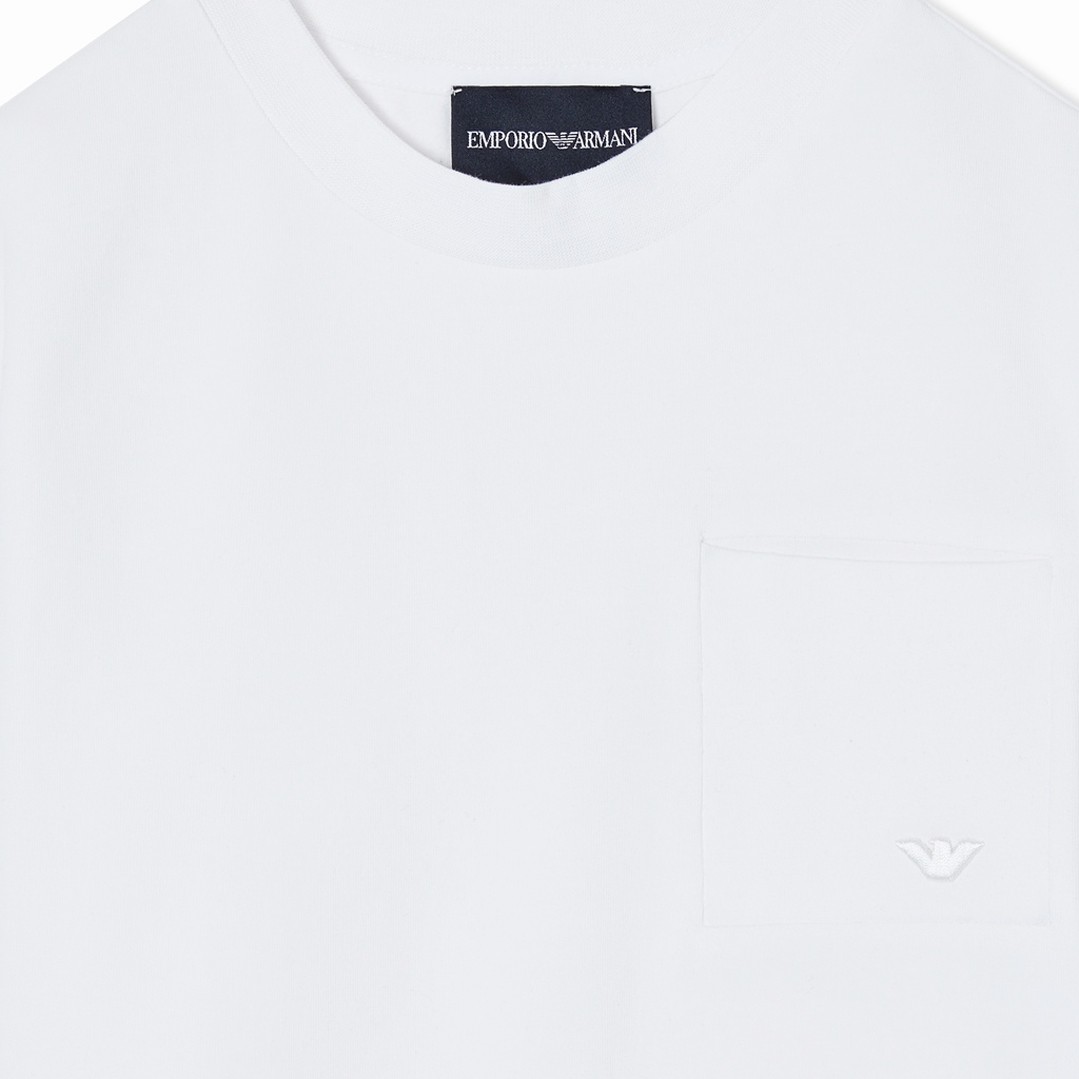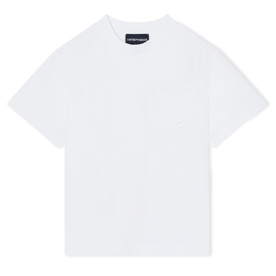 T-shirt dla chłopca Emporio Armani EB001318 AF21808 U0003. Koszulka z doskonałej jakości dzianiny bawełnianej w białym kolorze z kieszonką na piersi.