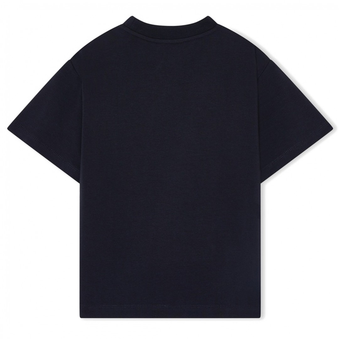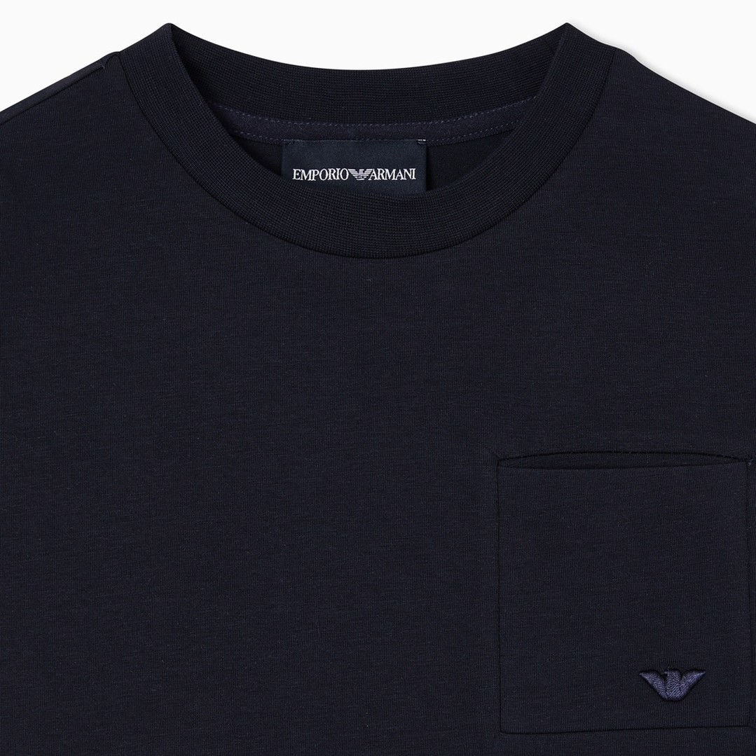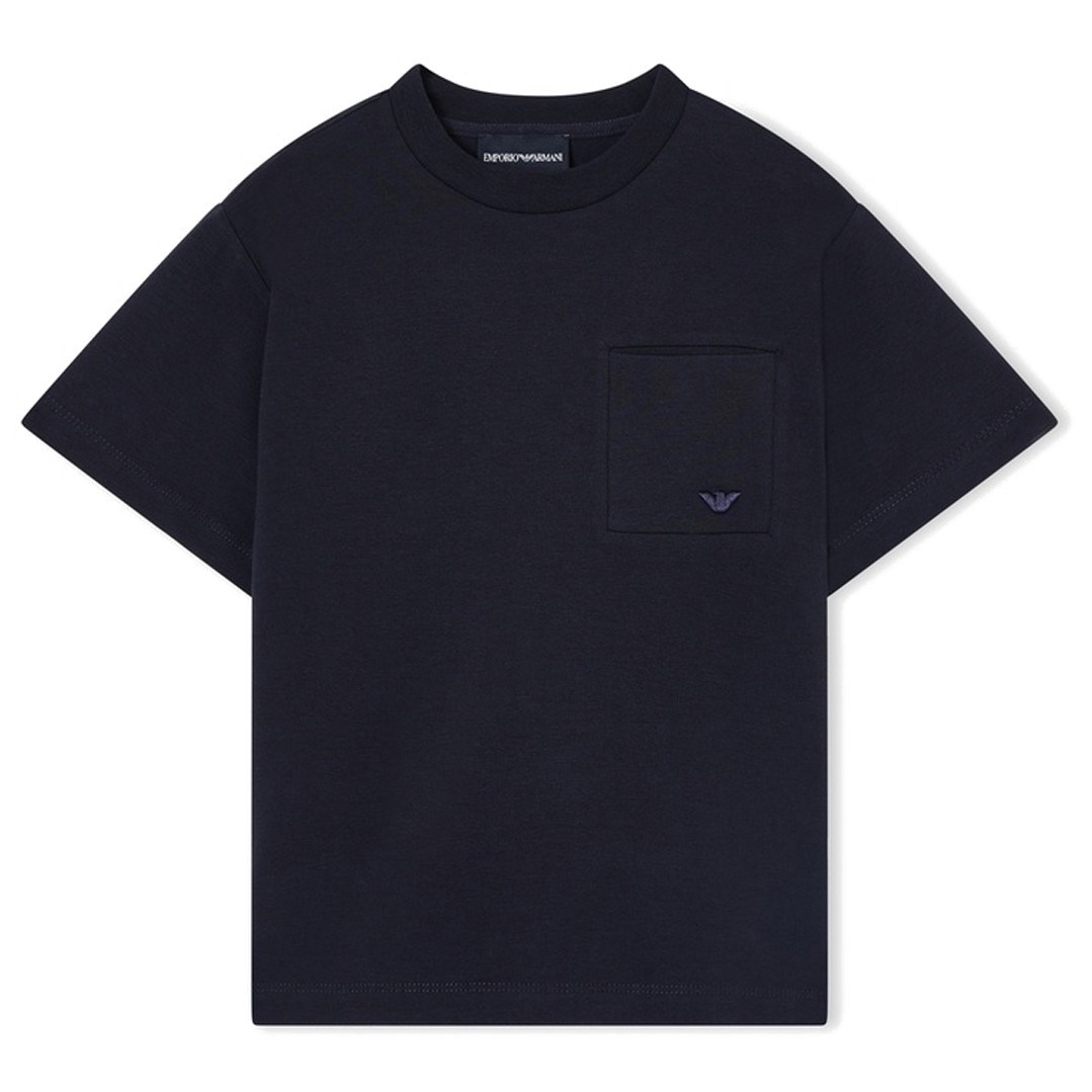 Klasyczny t-shirt chłopięcy Emporio Armani EB001318 AF21808 UB118. Koszulka z doskonałej jakości miękkiej dzianiny bawełnianej w głębokim granatowym kolorze z kieszonką na piersi.