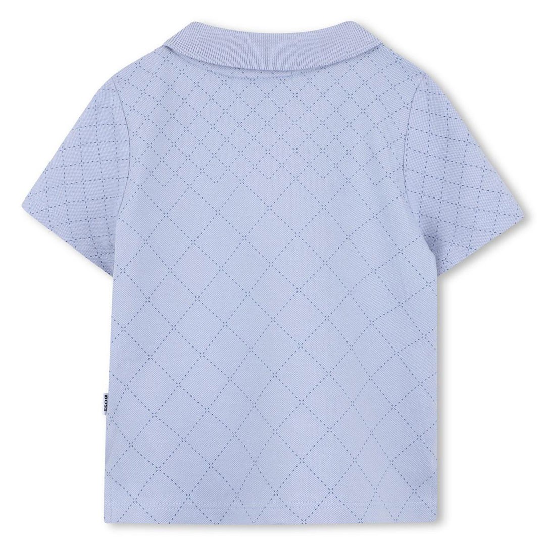 Niebieska koszulka polo dla małego chłopczyka Hugo Boss J52883 057. Polo uszute z dzianiny w romby i oryginalnie wykończone pod szyją.