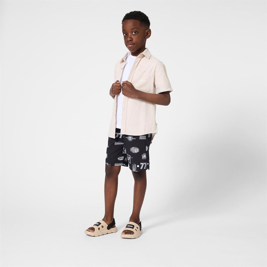 Letnia koszula chłopięca Hugo Boss J52942 130, uszyta z przewiewnego materiału - mieszanki lnu i bawełny w naturalnym kolorze. Model z krótkim rękawem i 2 naszytymi na piersiach kieszoniami. Jedna kieszeń ozdobiona haftem logo.