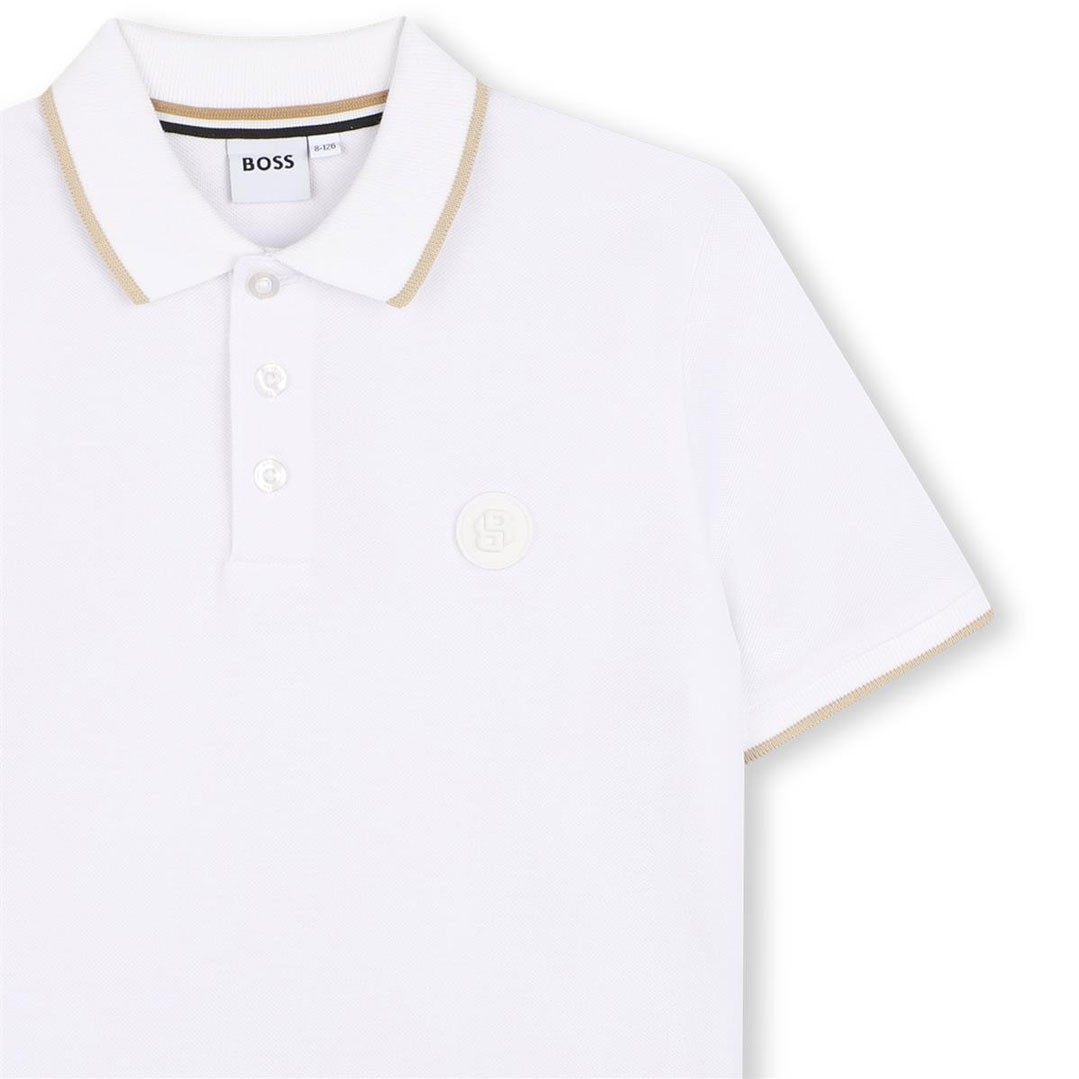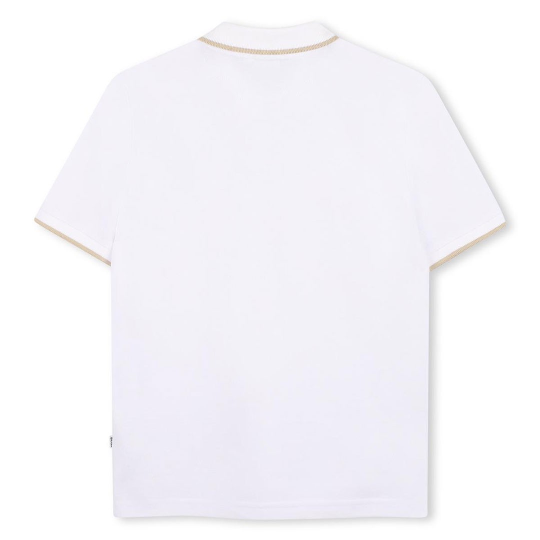 Chłopięca koszulka polo dla chłopca Hugo Boss J52952 10P. Polówka uszyta z białej, bawełnianej dzianiny z beżowymi detalami.
