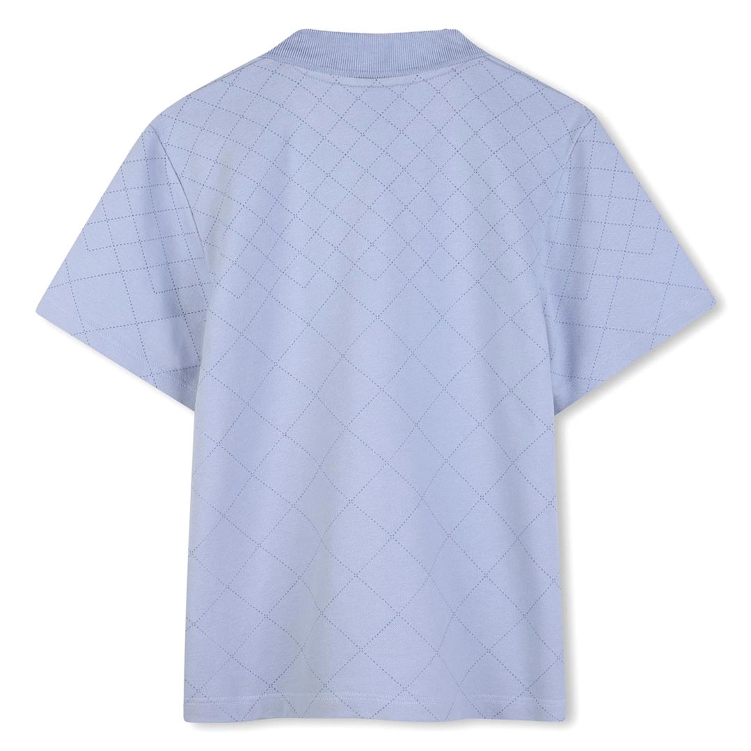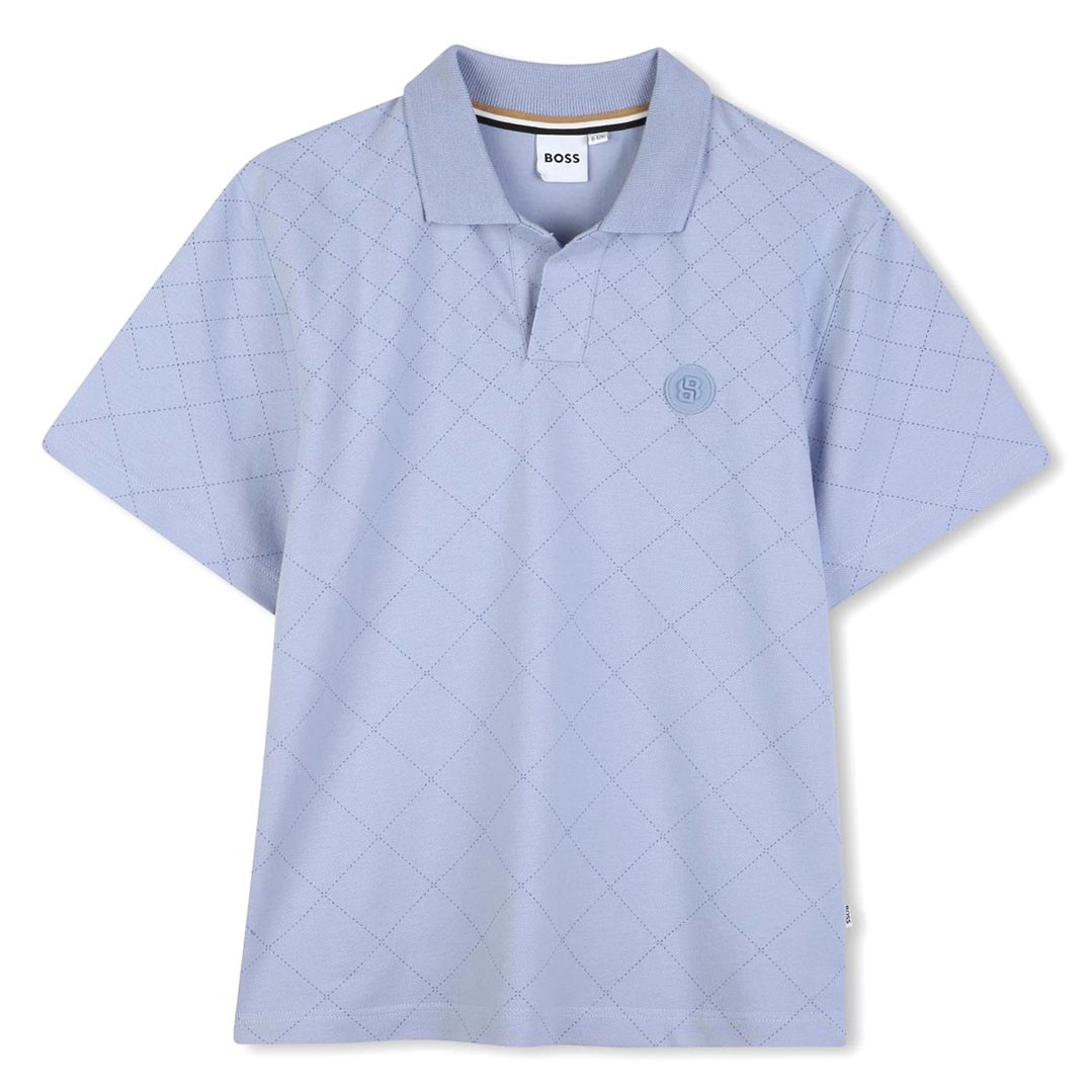 Oryginalna, niebieska koszulka polo dla chłopca Hugo Boss J52962 057. Model dostępny w rozmiarach 4 - 6 lat. Polo uszyte z bawełnianej dzianiny w romby, nietypowo wykończone pod szyją.