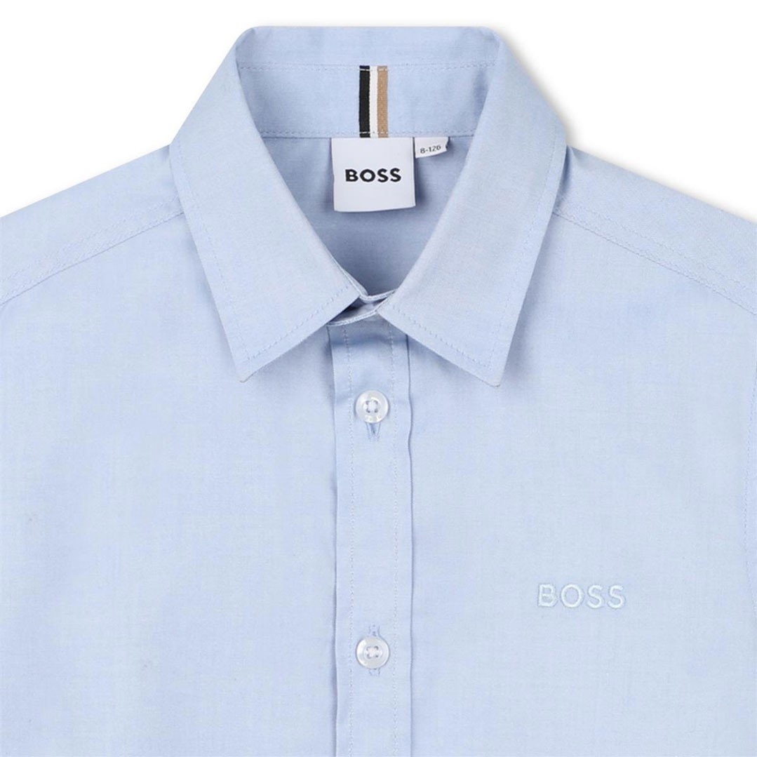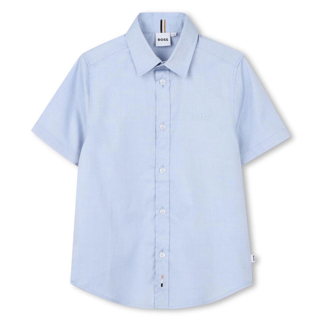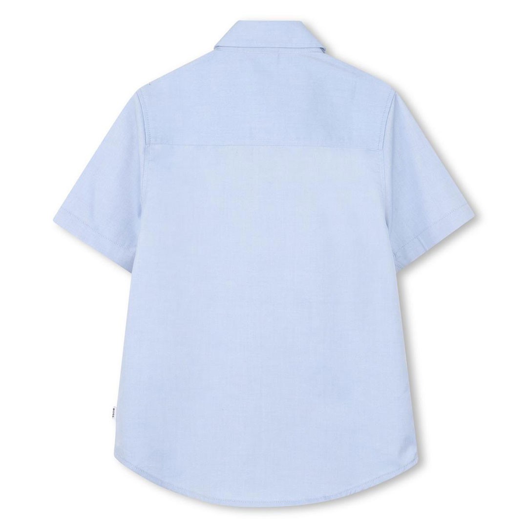 Niebieska koszula chłopięca Hugo Boss J53160 77D. Model z krótkim rękawem i haftowanym, dyskretnym logo na piersi.