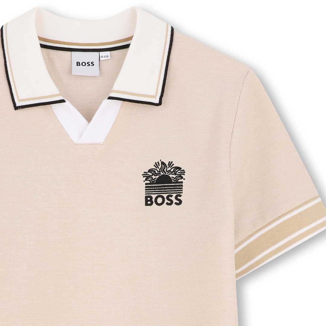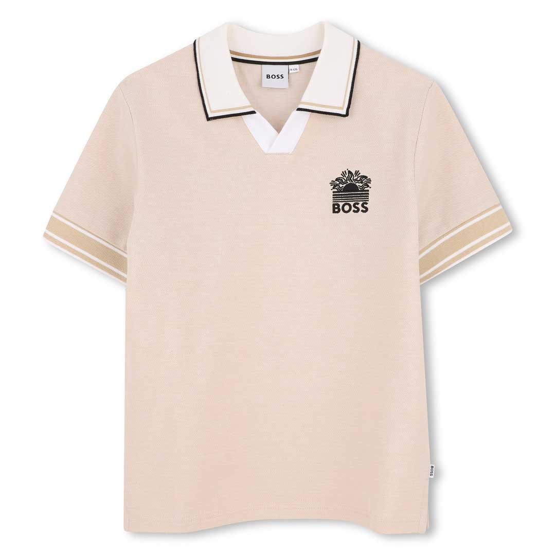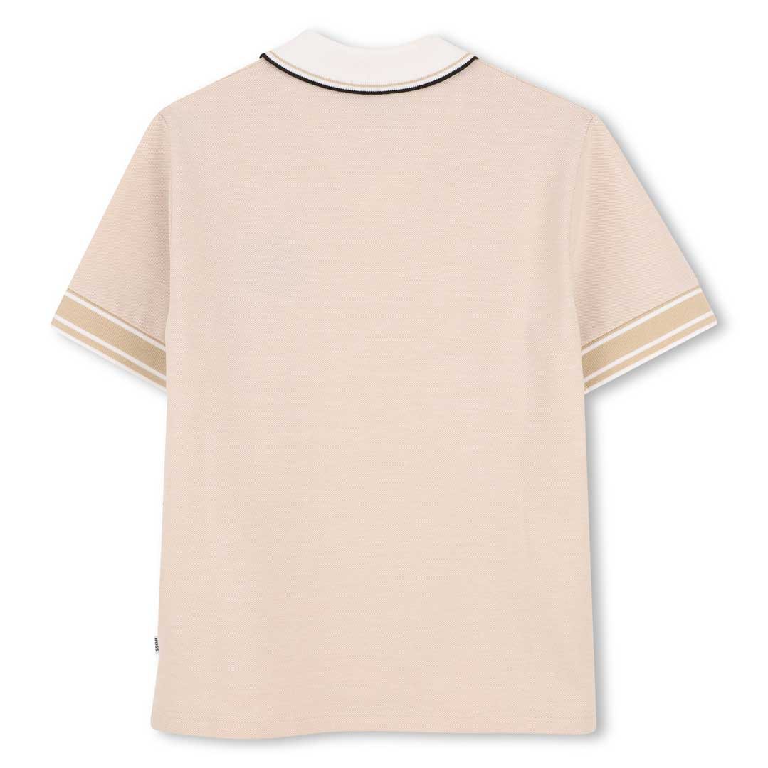 Beżowa koszulka polo dla chłopca Hugo Boss J53075 249 z oryginalnym wykończeniem pod szyją.