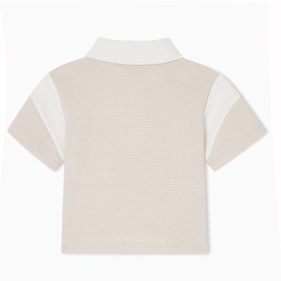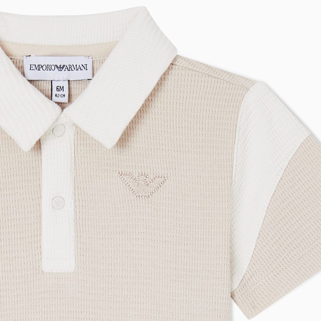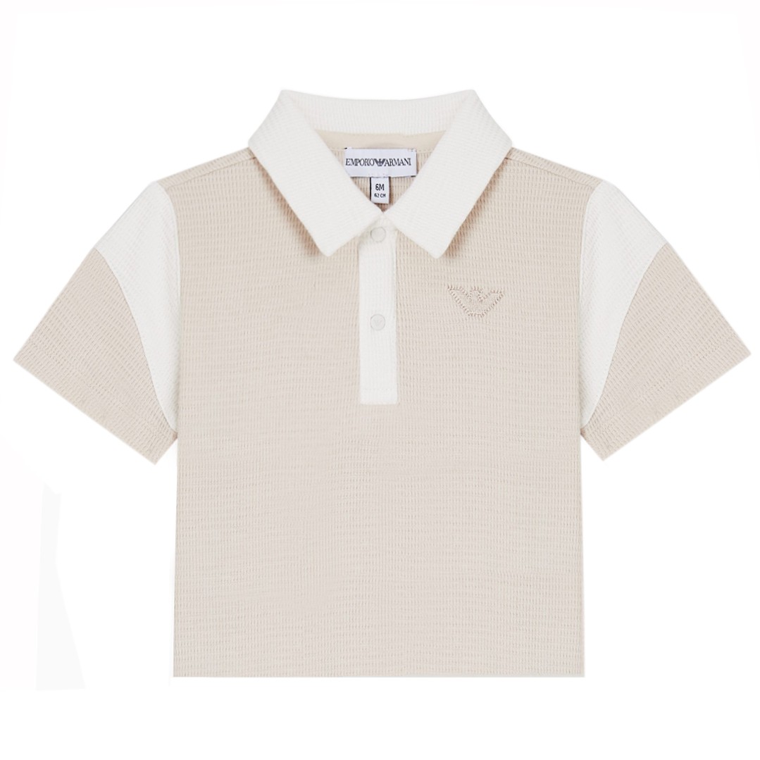 Koszulka polo dla małego chłopca Emporio Armani EB001090 AF21879 U1156. Polo w beżowym kolorze, uszyte z dzianiny o oryginalnej waflowej strukturze.