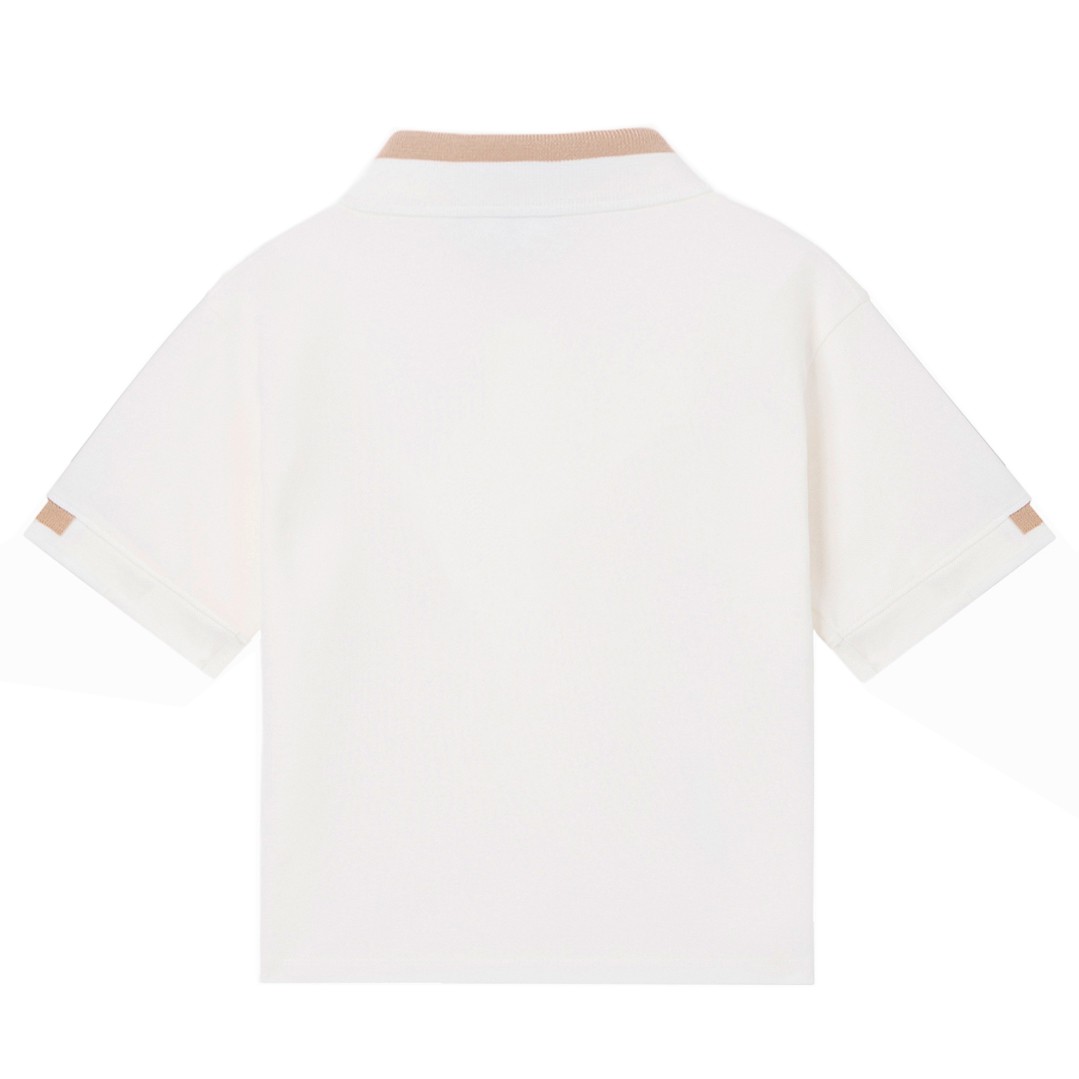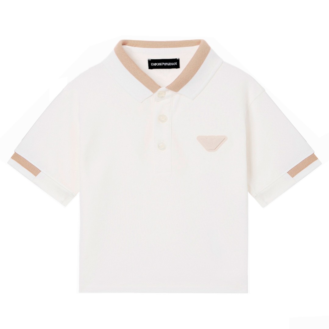 Biała koszulka polo dla niemowlaka i małego chłopczyka w wieku od 6 miesiecy do 3 lat, Emporio Armani EB001322 AF16641 U0003. Detale w beżowym kolorze.