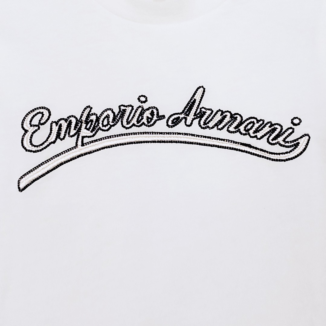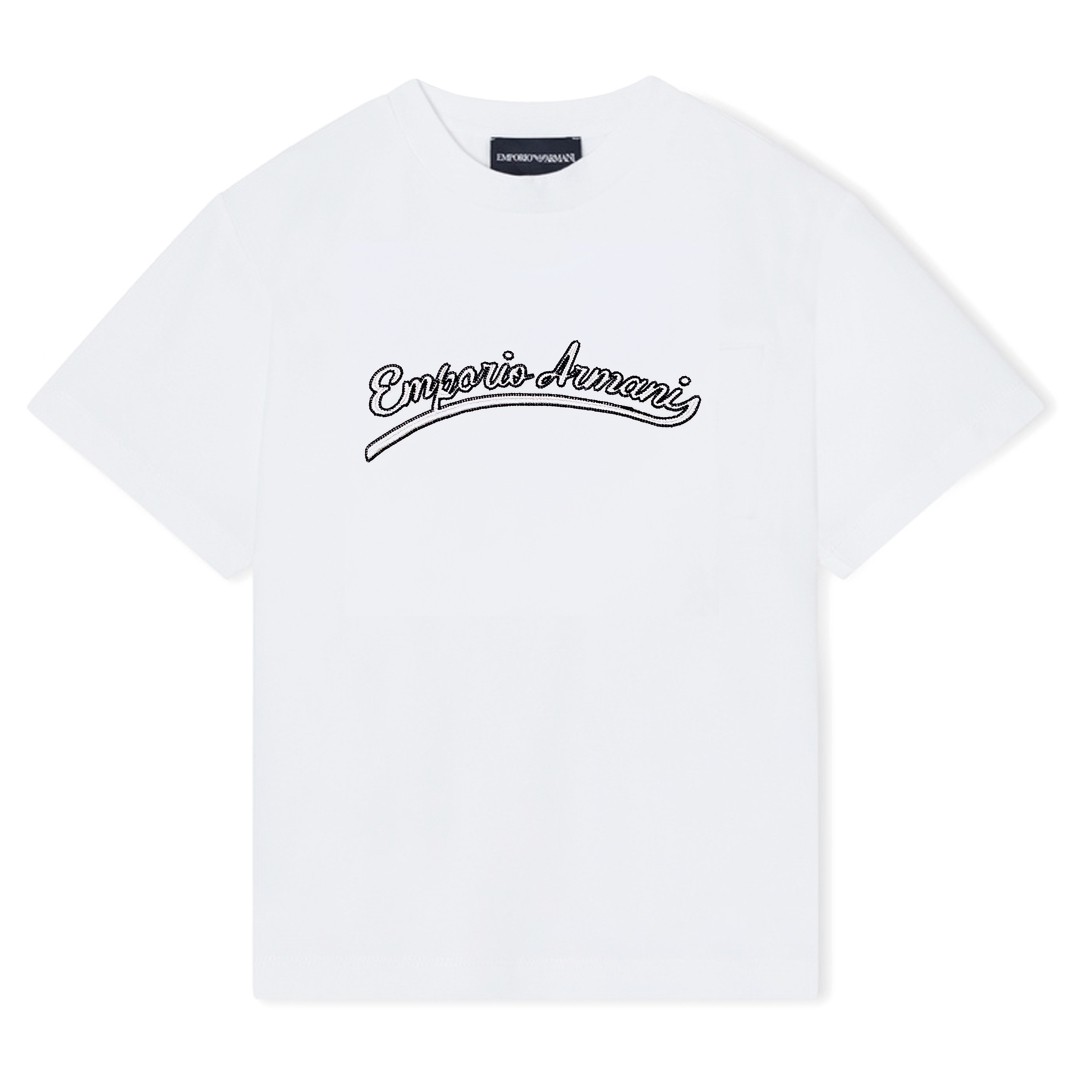 Biały t-shirt dla chłopca w wieku od 4 do 16 lat, Emporio Armani EB001623 AF13715 U0003. Fason klasyczny. Z przodu aplikacja w formie stylizowanego logo marki.