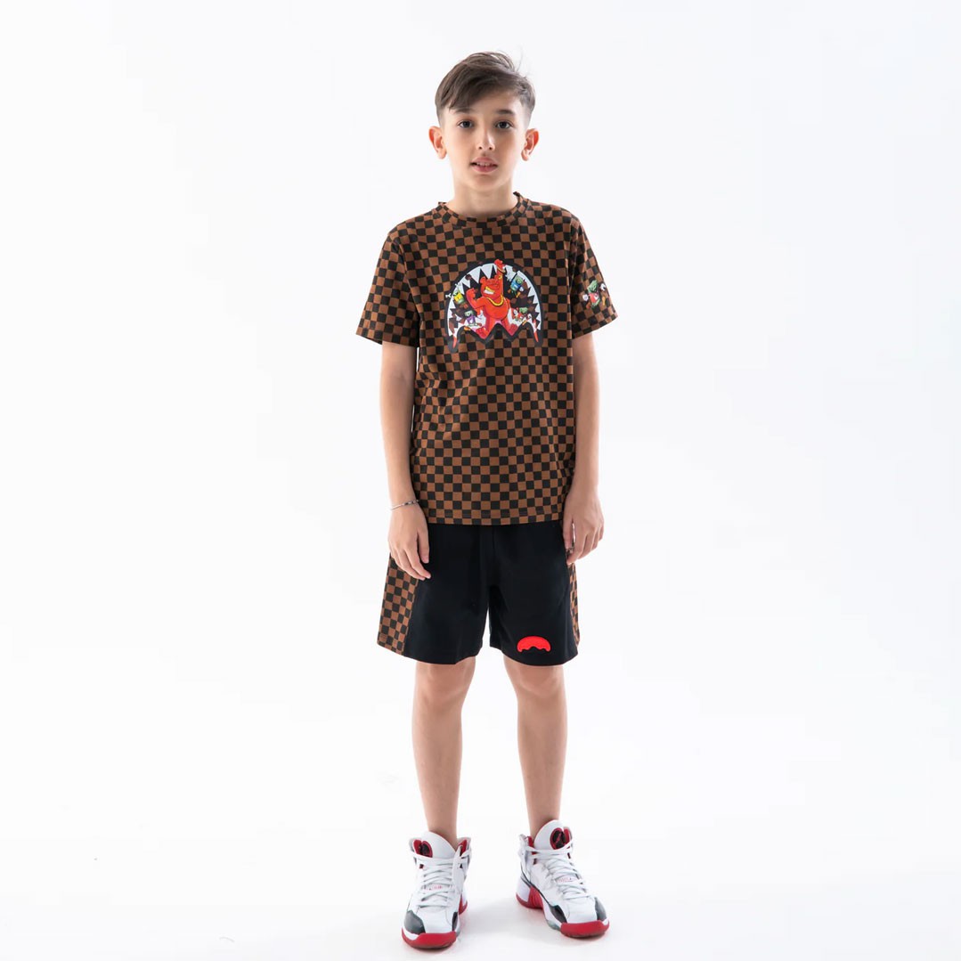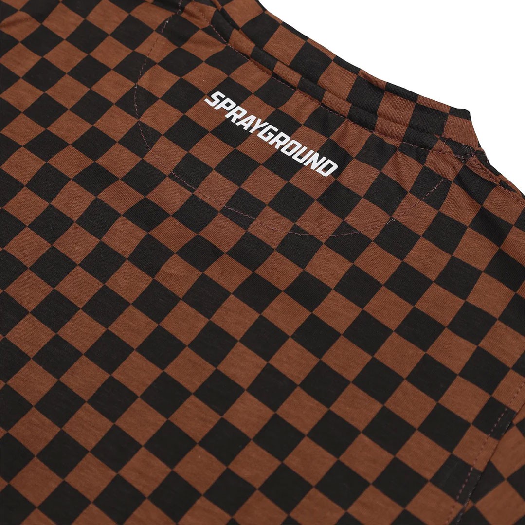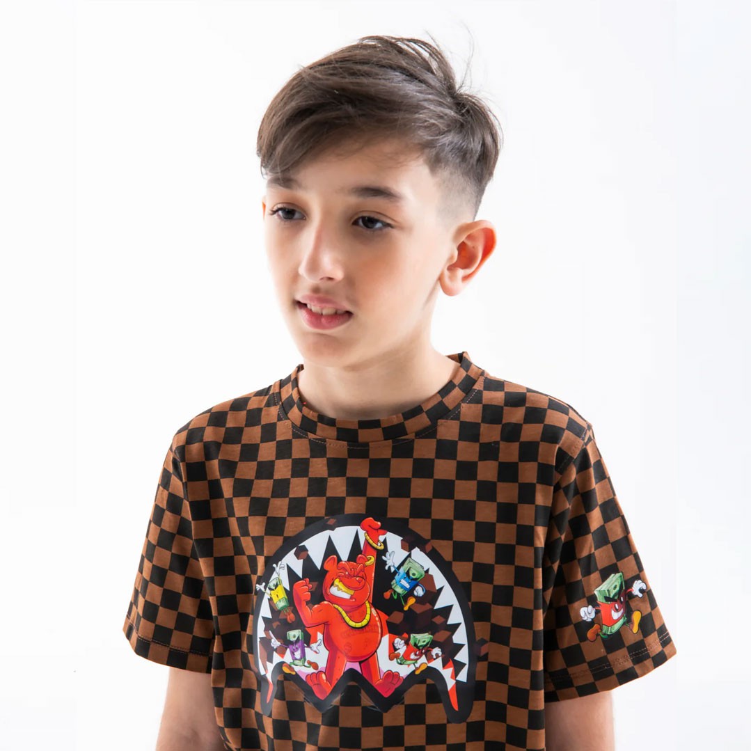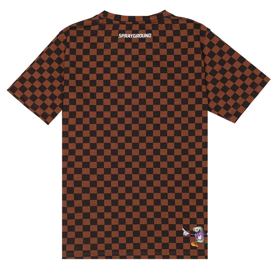 Oryginalna koszulka dla chłopca 8 - 16 lat Sprayground SPY1424. T-shirt uszyty z bawełnianej dzianiny drukowanej w brązowo-czarną szachownicę, ozdobiony kolorowymi nadrukami.