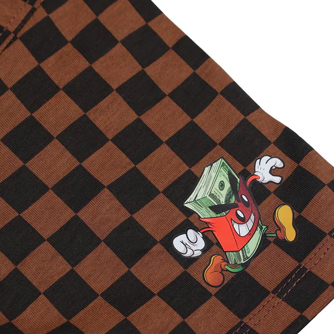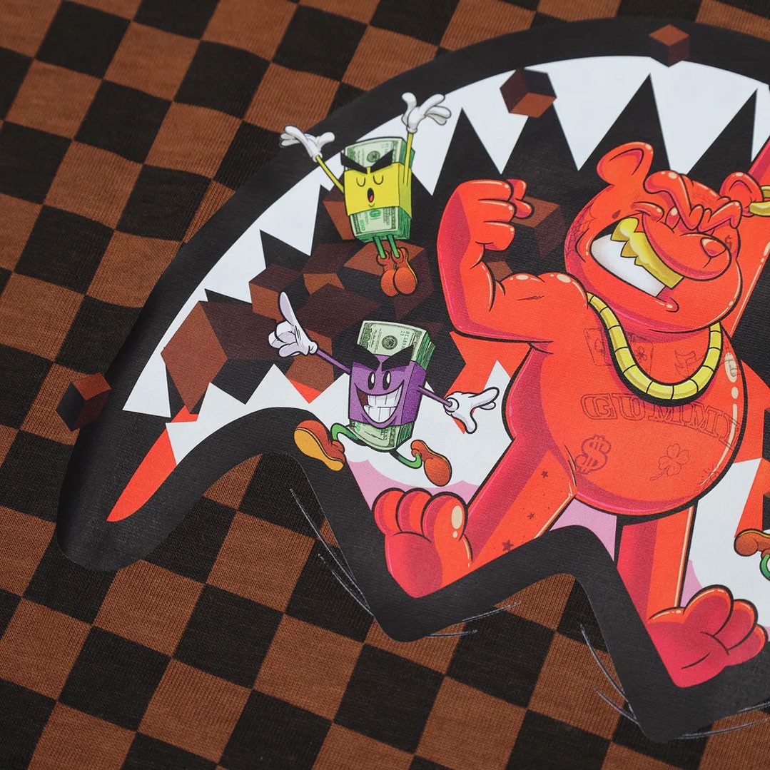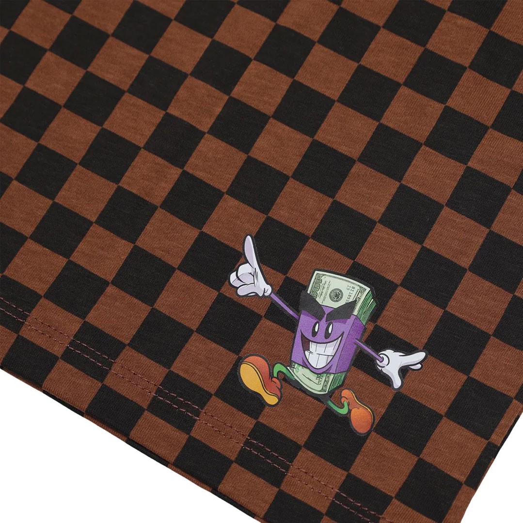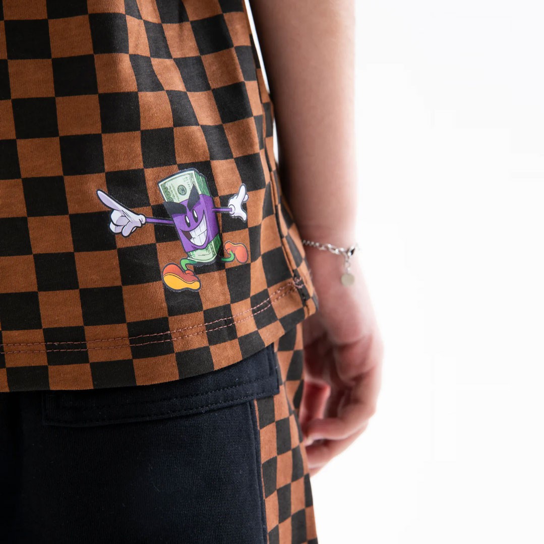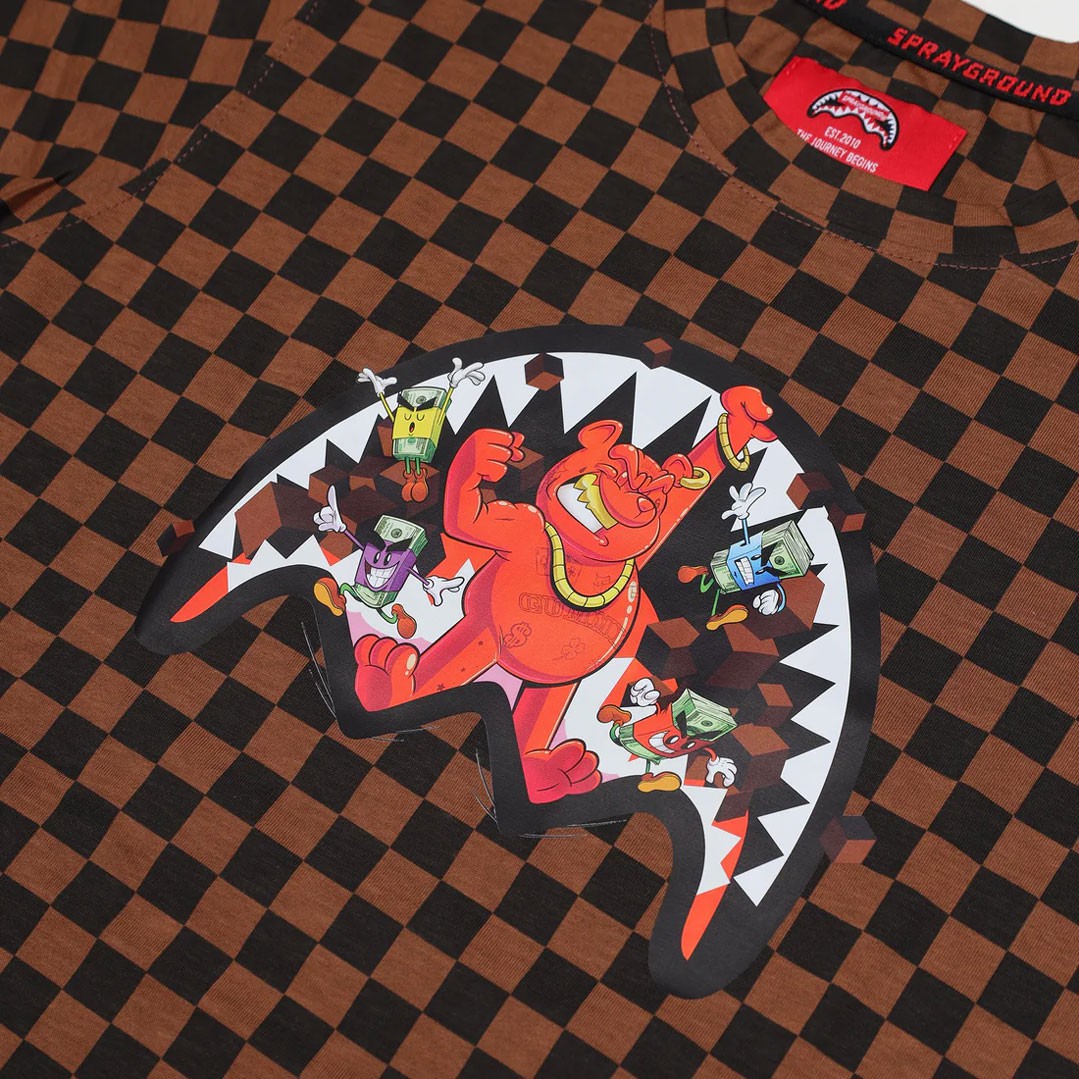Oryginalna koszulka dla chłopca 8 - 16 lat Sprayground SPY1424. T-shirt uszyty z bawełnianej dzianiny drukowanej w brązowo-czarną szachownicę, ozdobiony kolorowymi nadrukami.