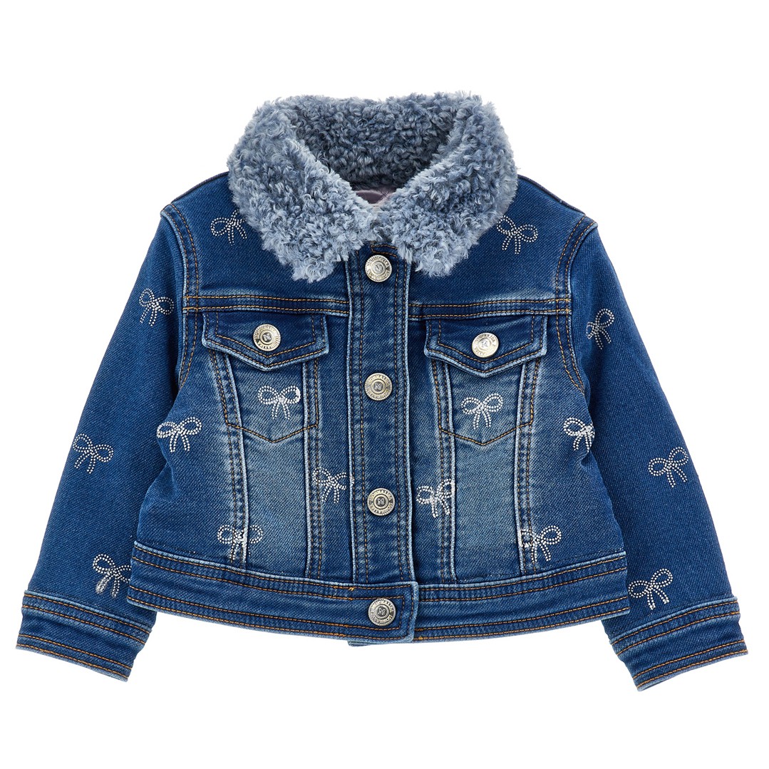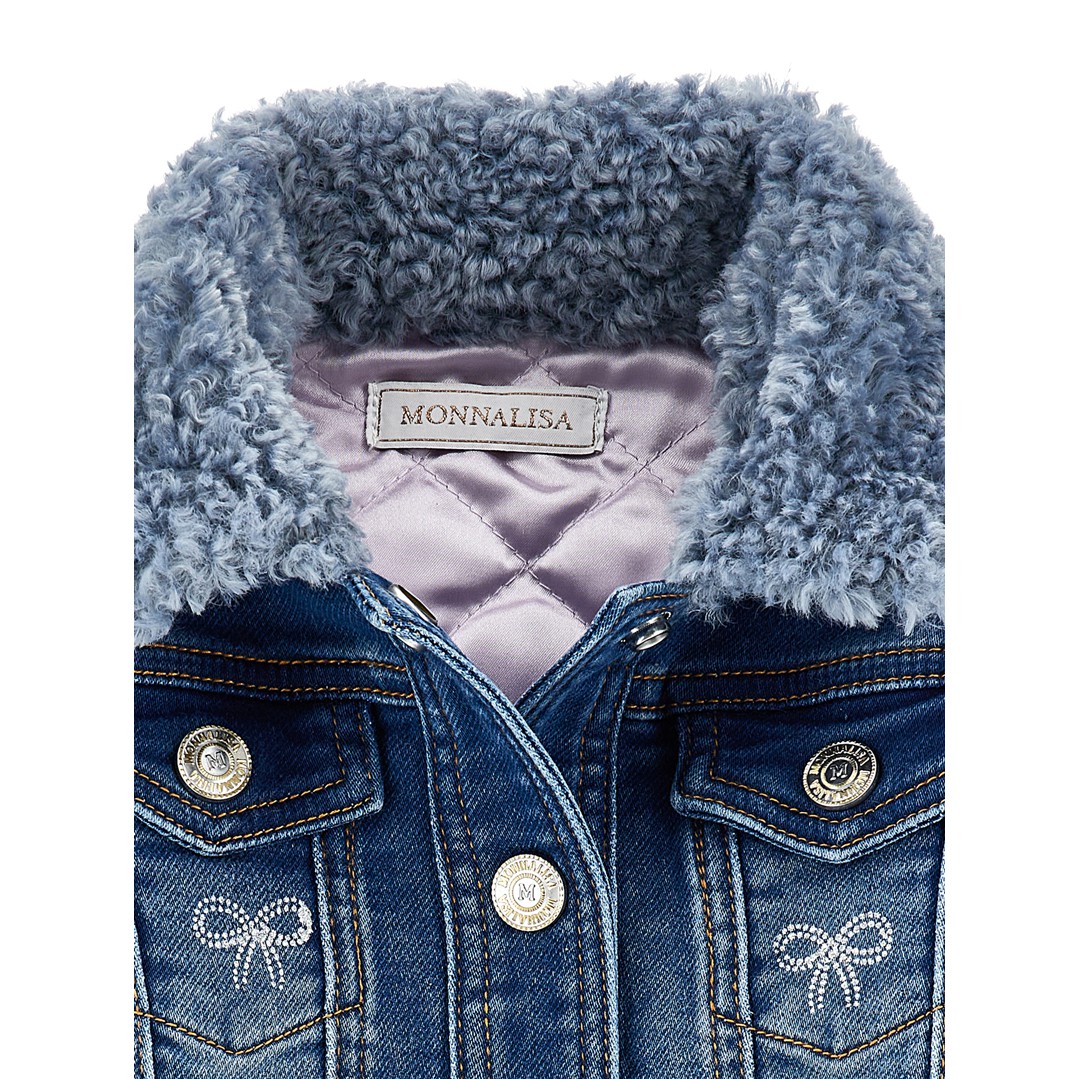 Jeansowa, bardzo miękka kurtka niemowlęca dla dziewczynki Monnalisa 39F101 6042 5590 Bebe PreFall Sweet Puppy. Kurtka w granatowym kolorze, lekko ocieplona, jesienna, zapinana na guziki, z naszytymi na piersi kieszeniami. Efektownym detalem jest odpinany, futrzany kołnierz. Podszewka z pikowanej w romby, gładkiej, bladoniebieskiej tkaniny o satynowym połysku.