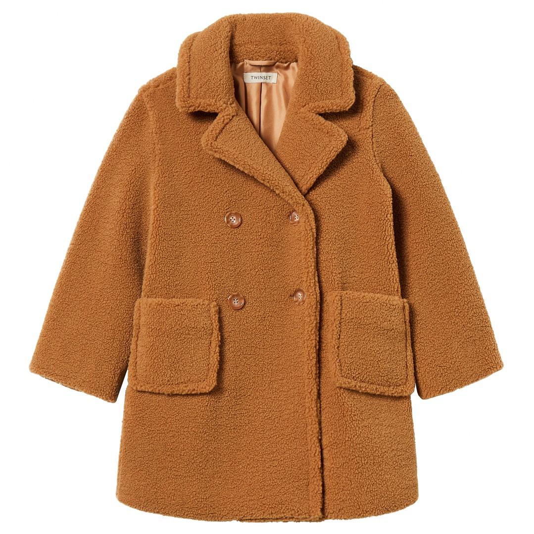 Płaszcz futerkowy dziewczęcy Twin Set. Ciepłe okrycie wierzchnie w karmelowym kolorze z dwurzędowym zapięciem na guziki. Z przodu naszywane kieszenie.